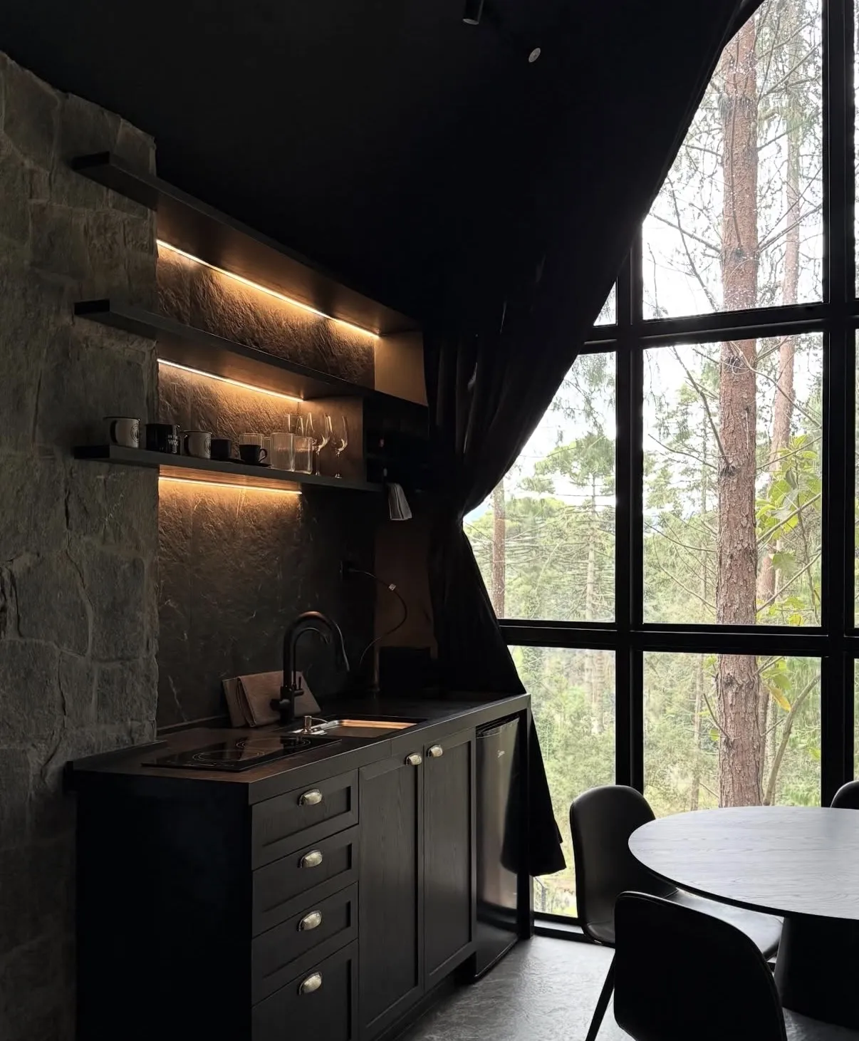 A Cabana Hill integra o complexo In the Woods e destaca-se pela vista elevada e pela sensação de privacidade proporcionada pelo entorno natural. A arquitetura valoriza a integração com o bosque, com pé-direito alto, ampla janela frontal e ambientes que permitem contemplar a copa das árvores, criando uma experiência imersiva e acolhedora.