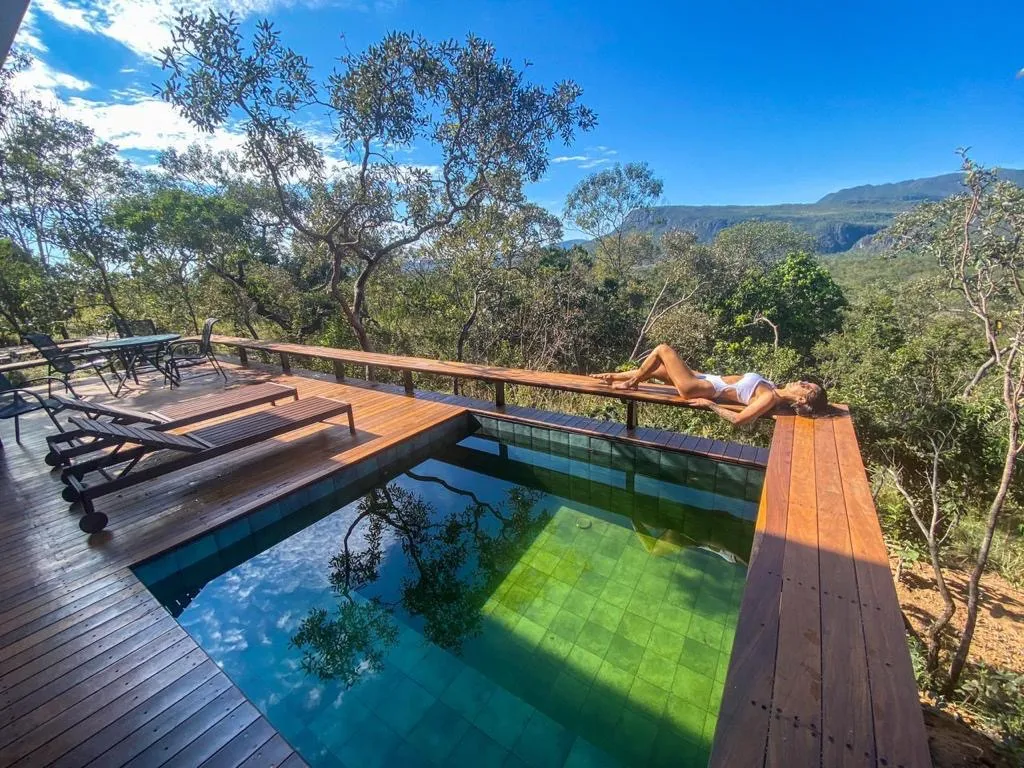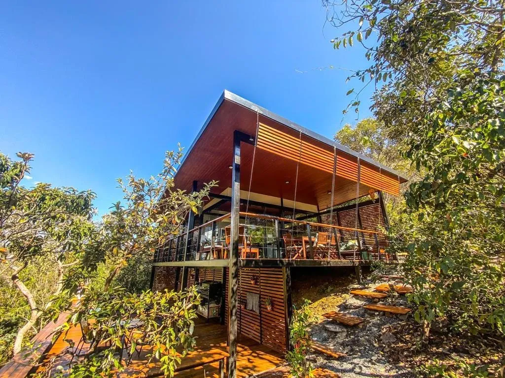 A casa está localizada dentro de um condomínio fechado em meio ao cerrado com vista para a Serra de Santana, localizada no Parque Nacional da Chapada dos Veadeiros. A apenas 3,5 km do centro de Cavalcante e próximo a várias cachoeiras.