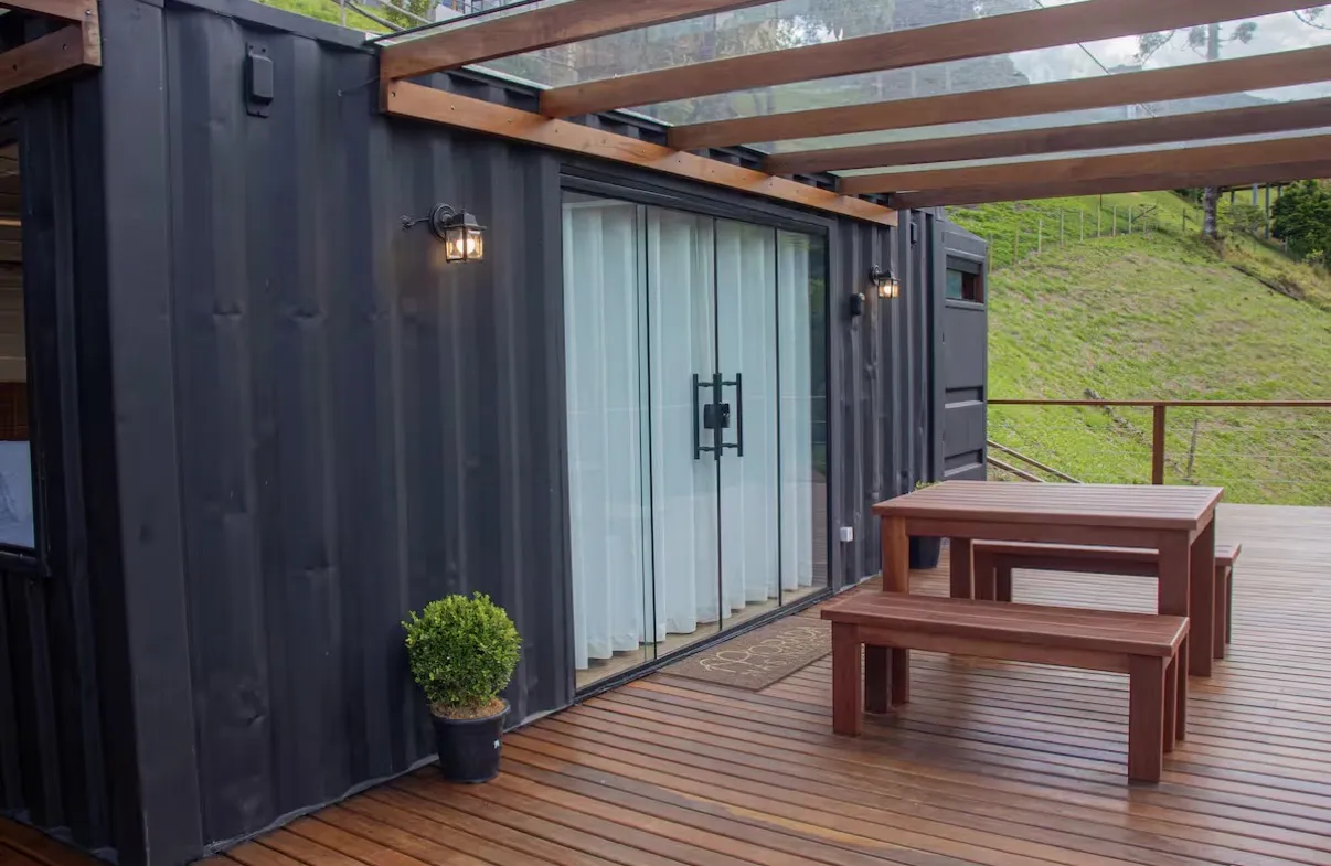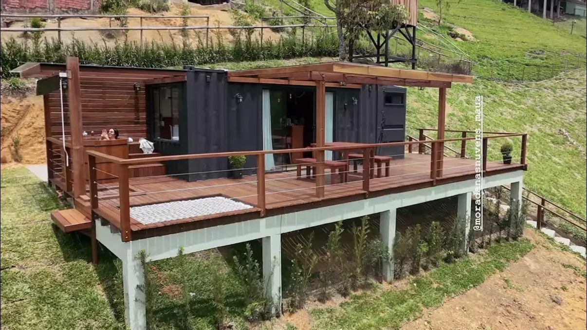 O chalé container foi idealizado para proporcionar ao casal um ambiente de reconexão e renovação, com máximo conforto e detalhes pensados para uma estadia especial. A área interna reúne quarto, banheiro e cozinha equipada com utensílios e eletrodomésticos, criando um espaço funcional e acolhedor.