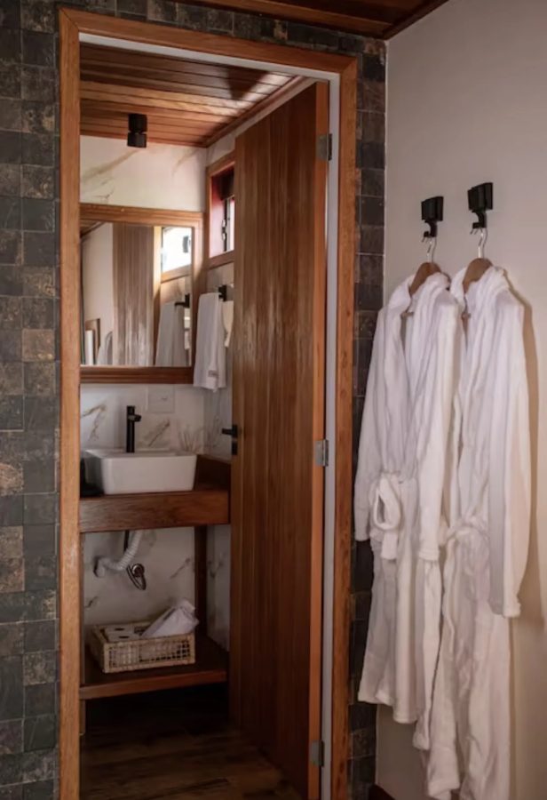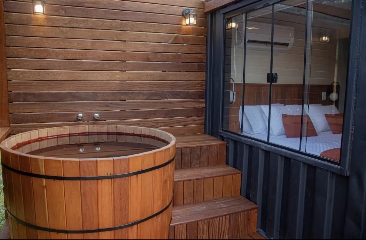 Na parte externa, o deck conta com ofurô de água quente e rede suspensa, complementando a experiência ao ar livre. Cercado por um cenário sereno, o chalé oferece um clima romântico em meio à natureza, ideal para desacelerar e viver momentos de tranquilidade.