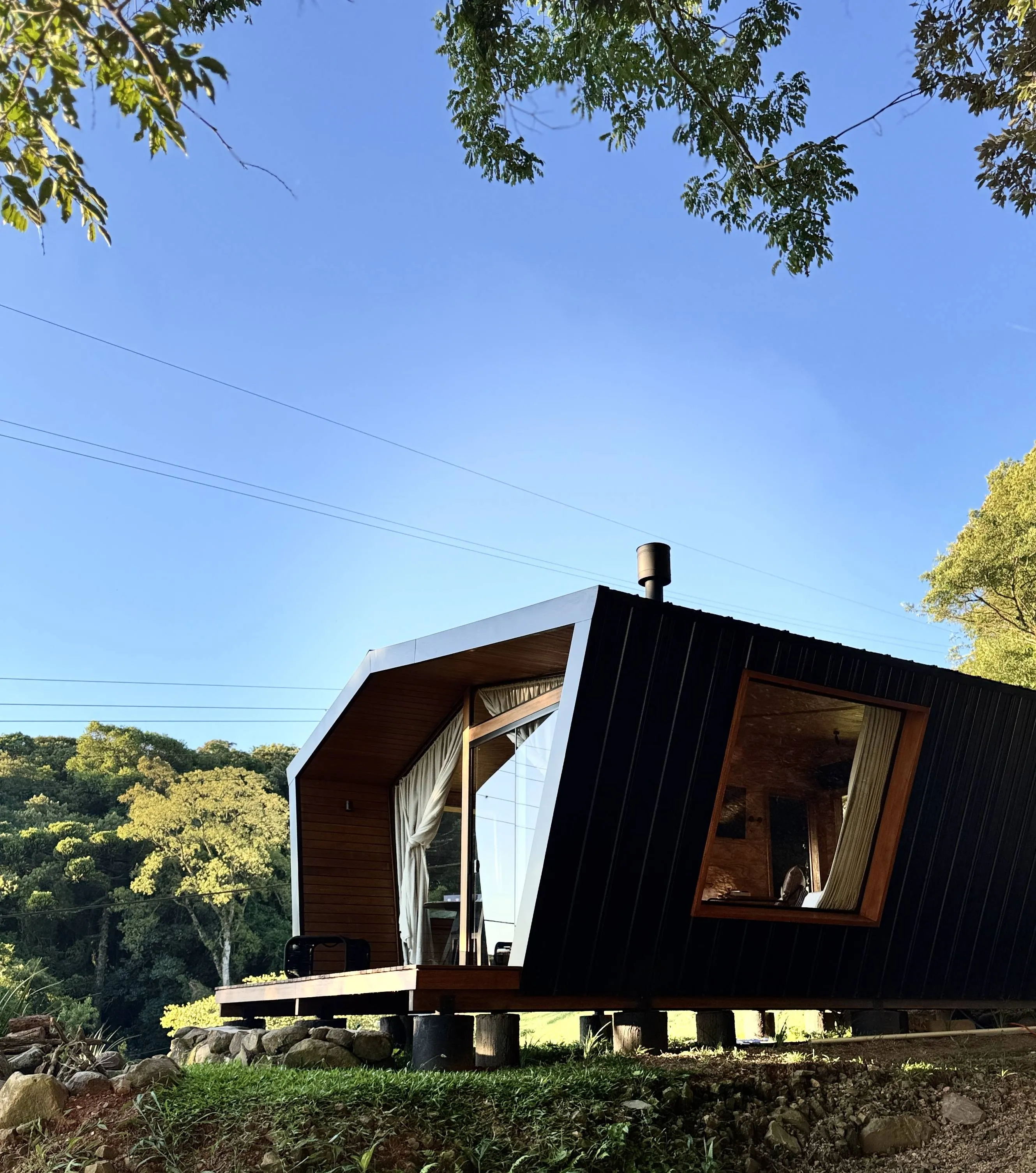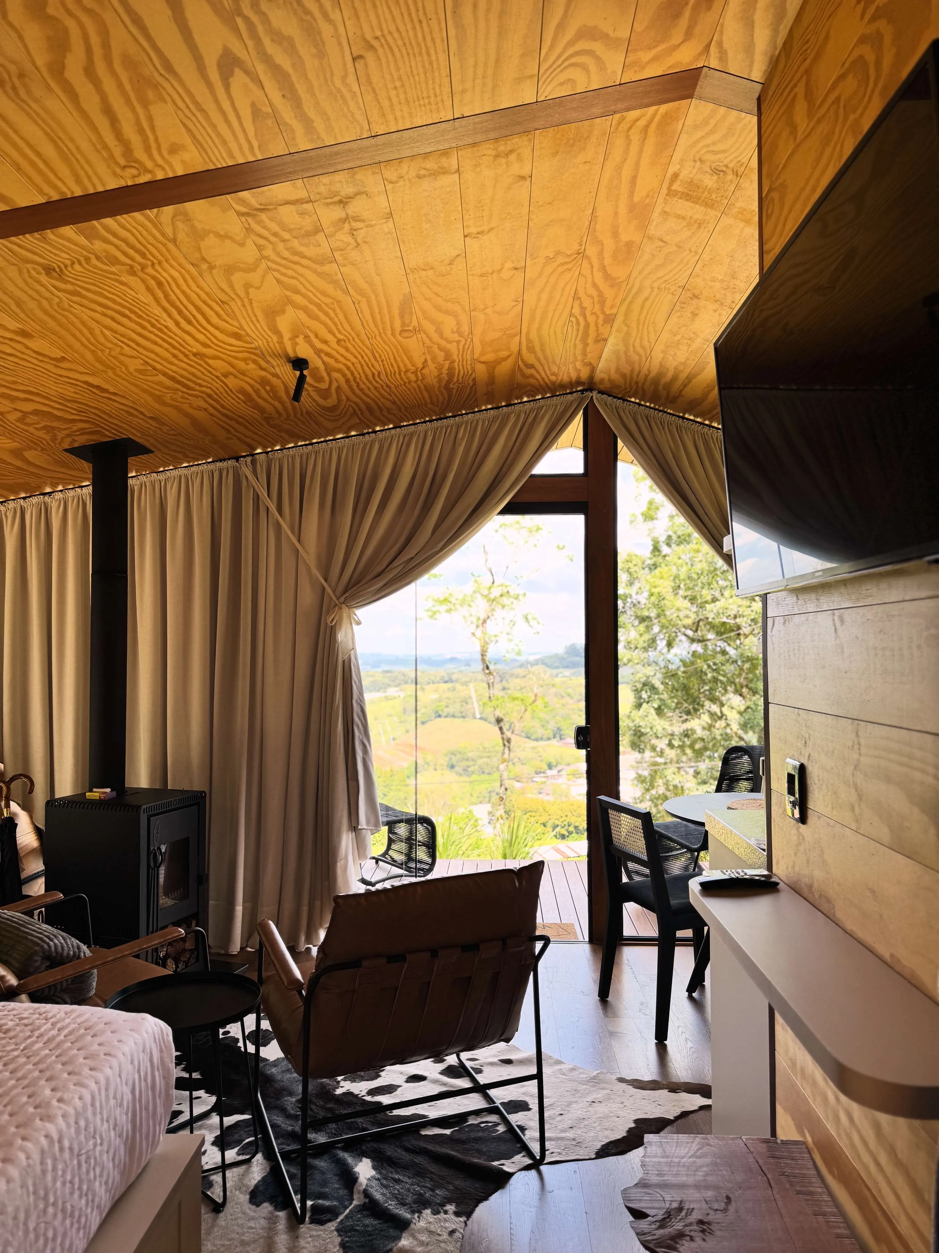 A cabana Nostro Rifugio está situada em Nova Pádua, nos Vales da Serra Gaúcha, em um cenário que convida ao descanso e à contemplação. Com arquitetura inovadora e interior marcado pela presença predominante da madeira, poltronas em couro e lareira acolhedora, o espaço combina charme e conforto em perfeita harmonia. É o refúgio ideal para quem deseja desacelerar e se reconectar em meio à paisagem do vale.