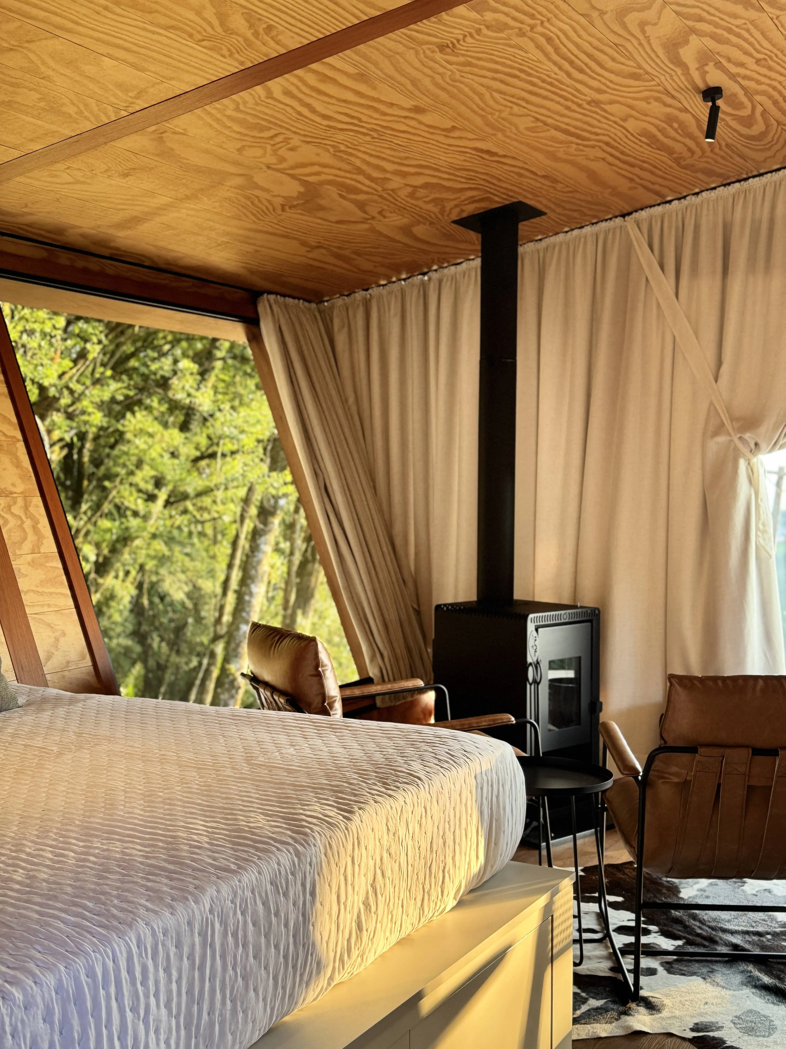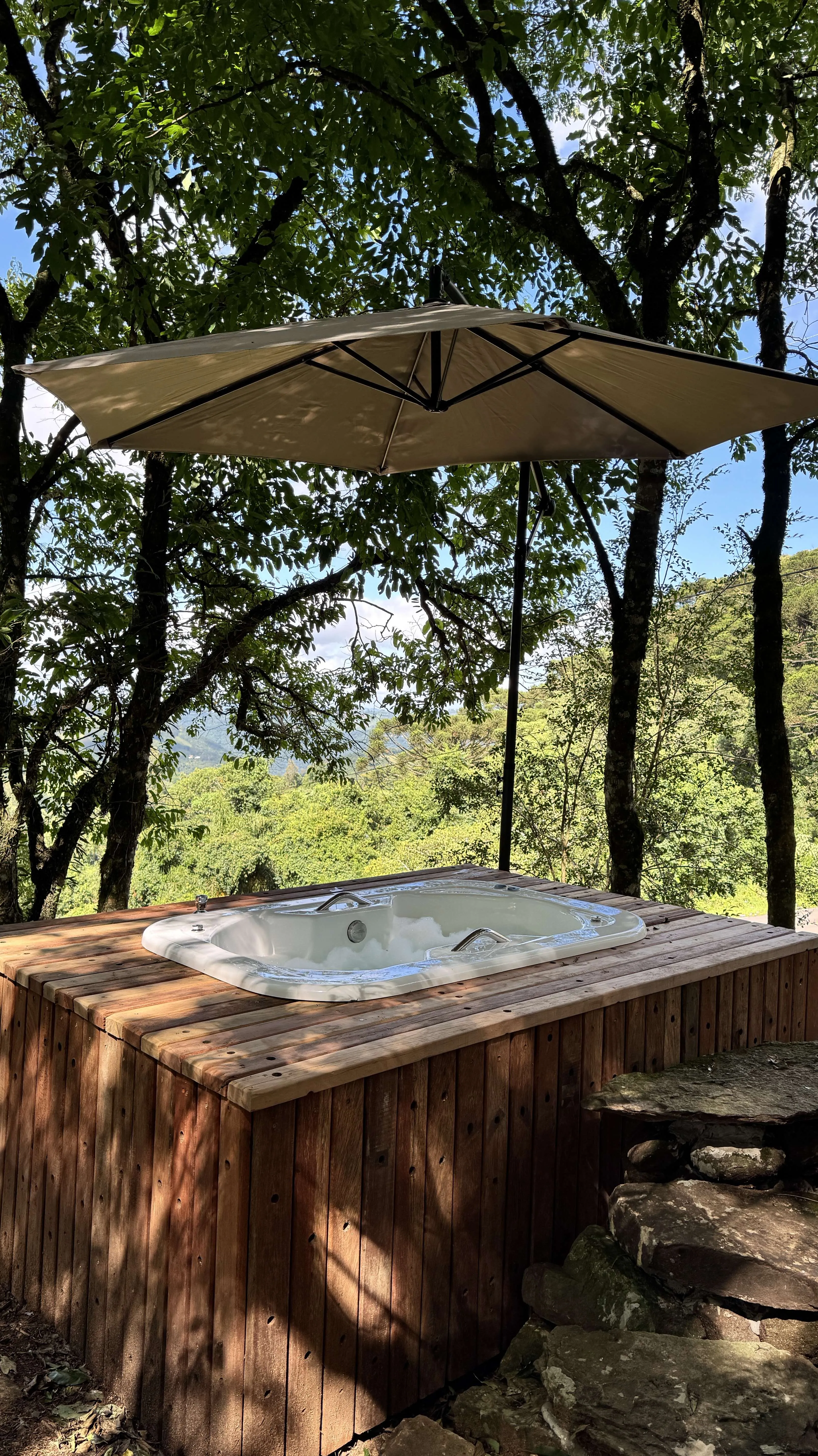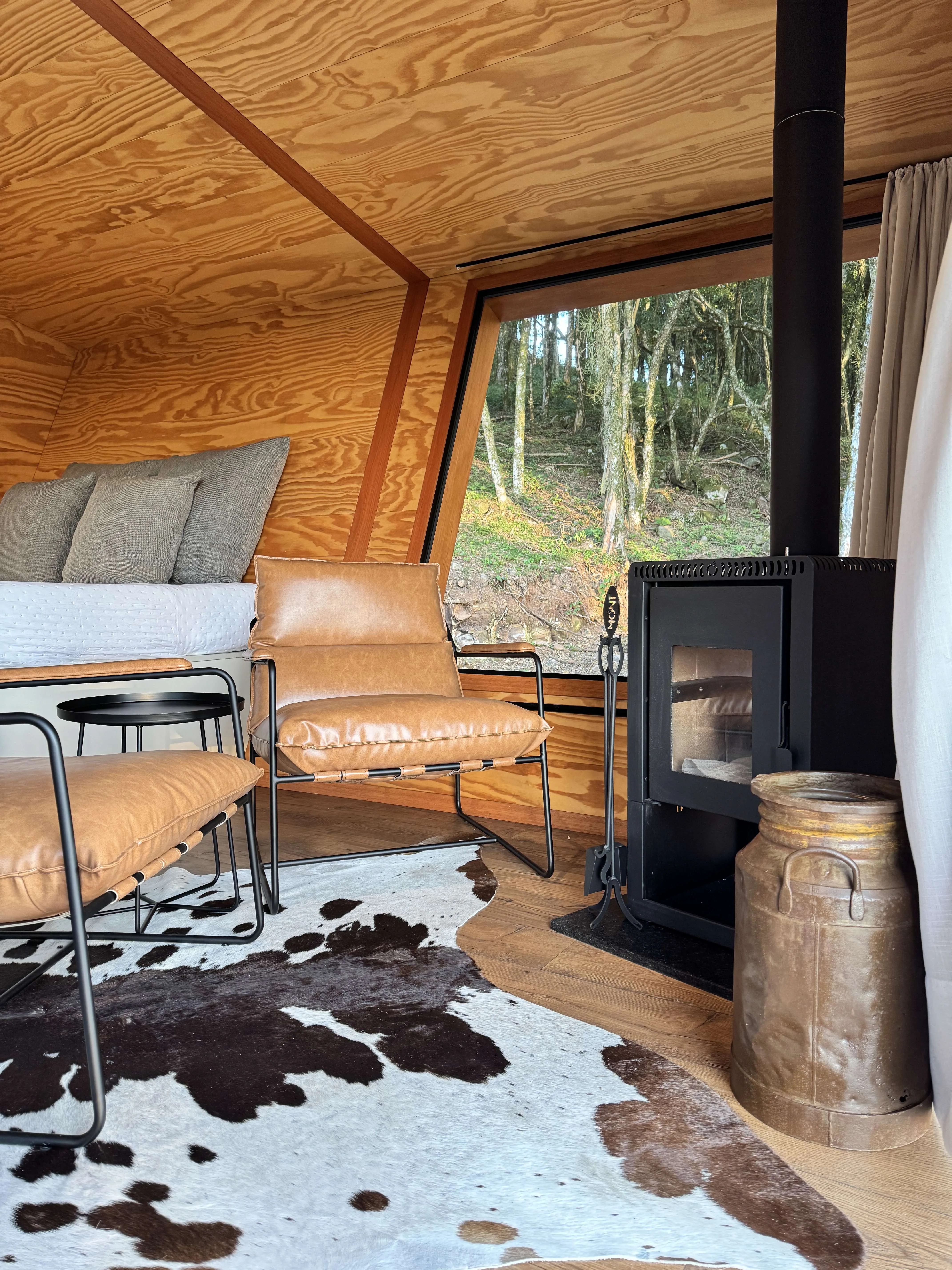 A acomodação dispõe de cama queen size e cozinha completa equipada com fogão, forno elétrico, micro-ondas, torradeira, frigobar, louças e utensílios para o preparo de refeições. Conta ainda com poltronas internas e externas para apreciar a vista de diferentes ângulos, lareira canadense no interior e espaço externo preparado para fogueira, com lenha disponível. O banho proporciona experiência sensorial com aquecimento a gás e piso revestido em pedras, enquanto o ofurô com água aquecida e cromoterapia convida ao relaxamento. A estadia inclui cesta de café da manhã cuidadosamente preparada, com itens selecionados para um início de dia especial.