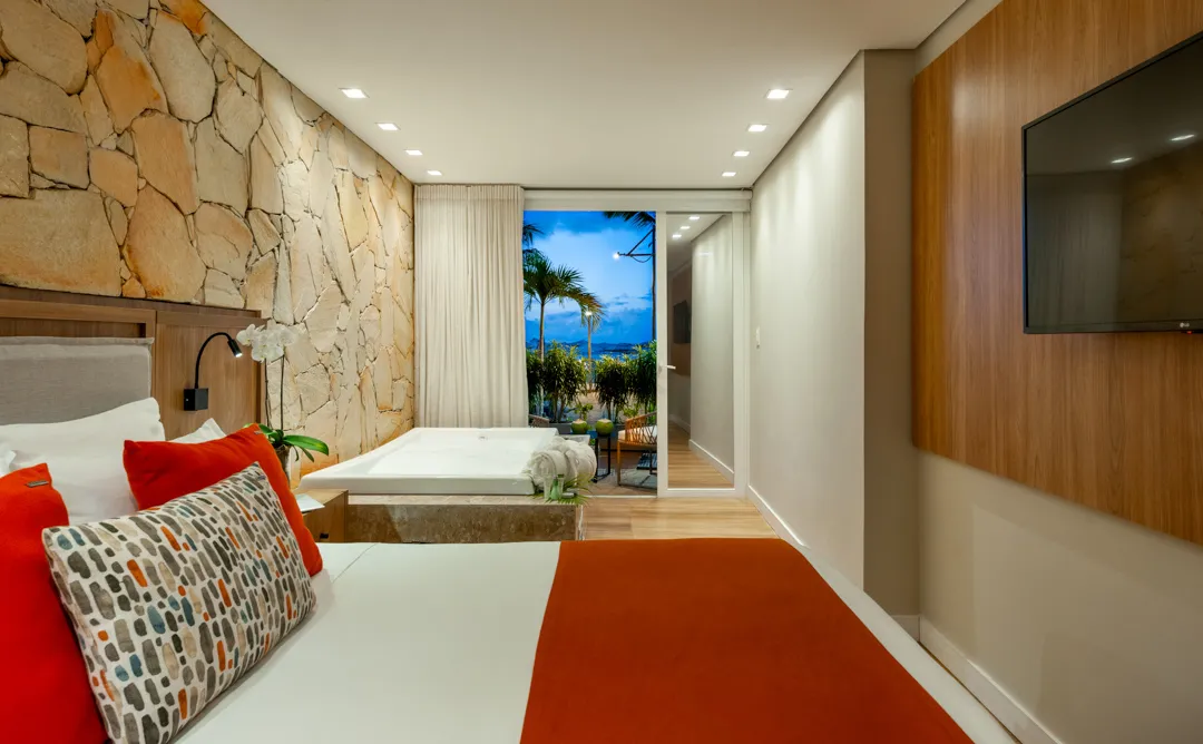 As acomodações são confortáveis, bem decoradas e incluem diversas categorias, desde suítes duplas aconchegantes até opções com vista para o mar e piscina privativa.