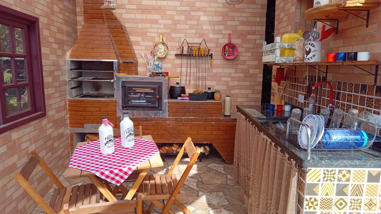 Área gourmet completa (churrasqueira, forno e fogão à lenha)