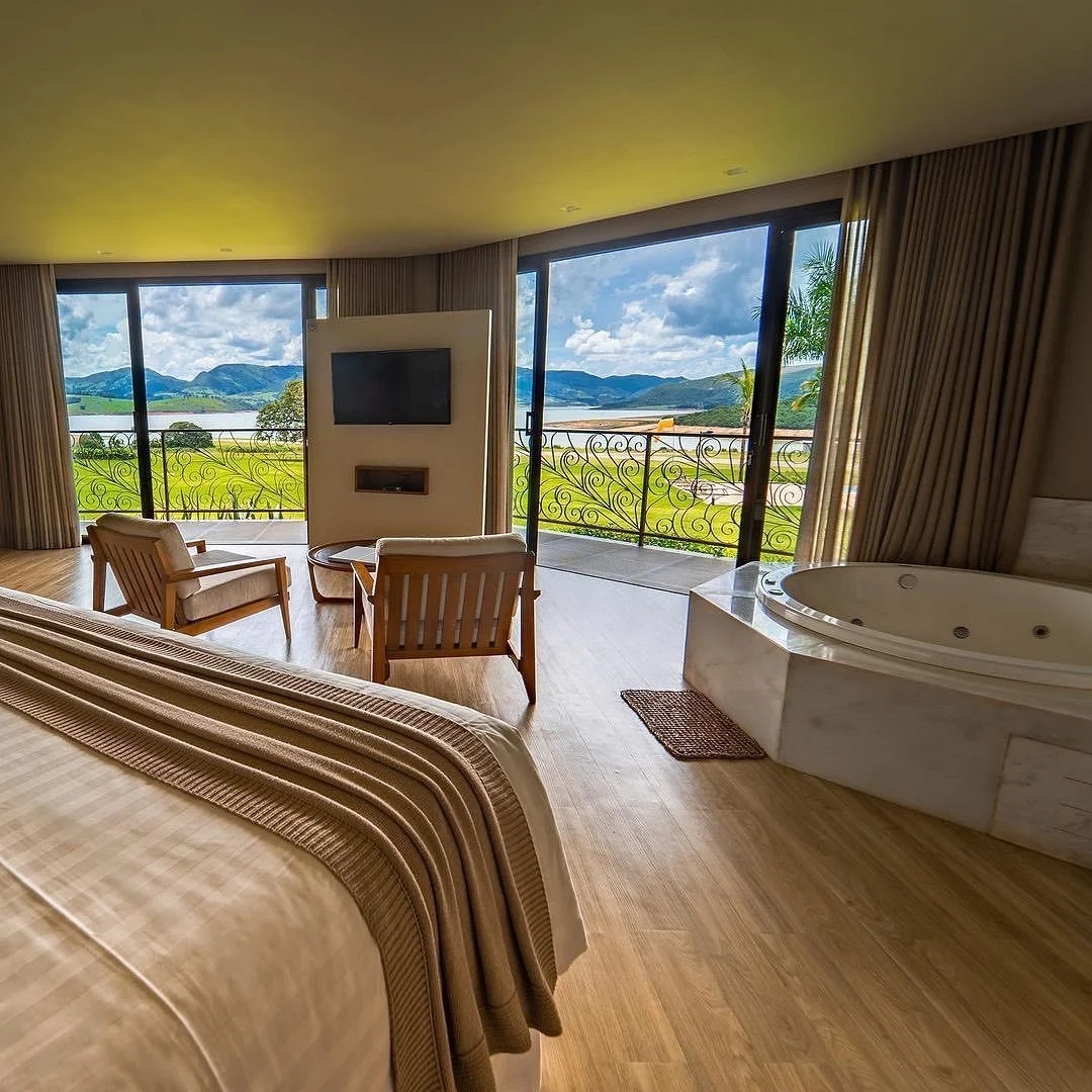 Ar condicionado Secador de cabelo TV a cabo / Smart TV Jacuzzi / Ofurô / Banheira Coberta Frigobar Lareira Máquina de Café Enxoval de Luxo (+ Roupão e Pantufa) Sauna Cozinha Estação de trabalho (mesa e cadeira) Piscina Aquecida ou climatizada Borda Infinita Coberta