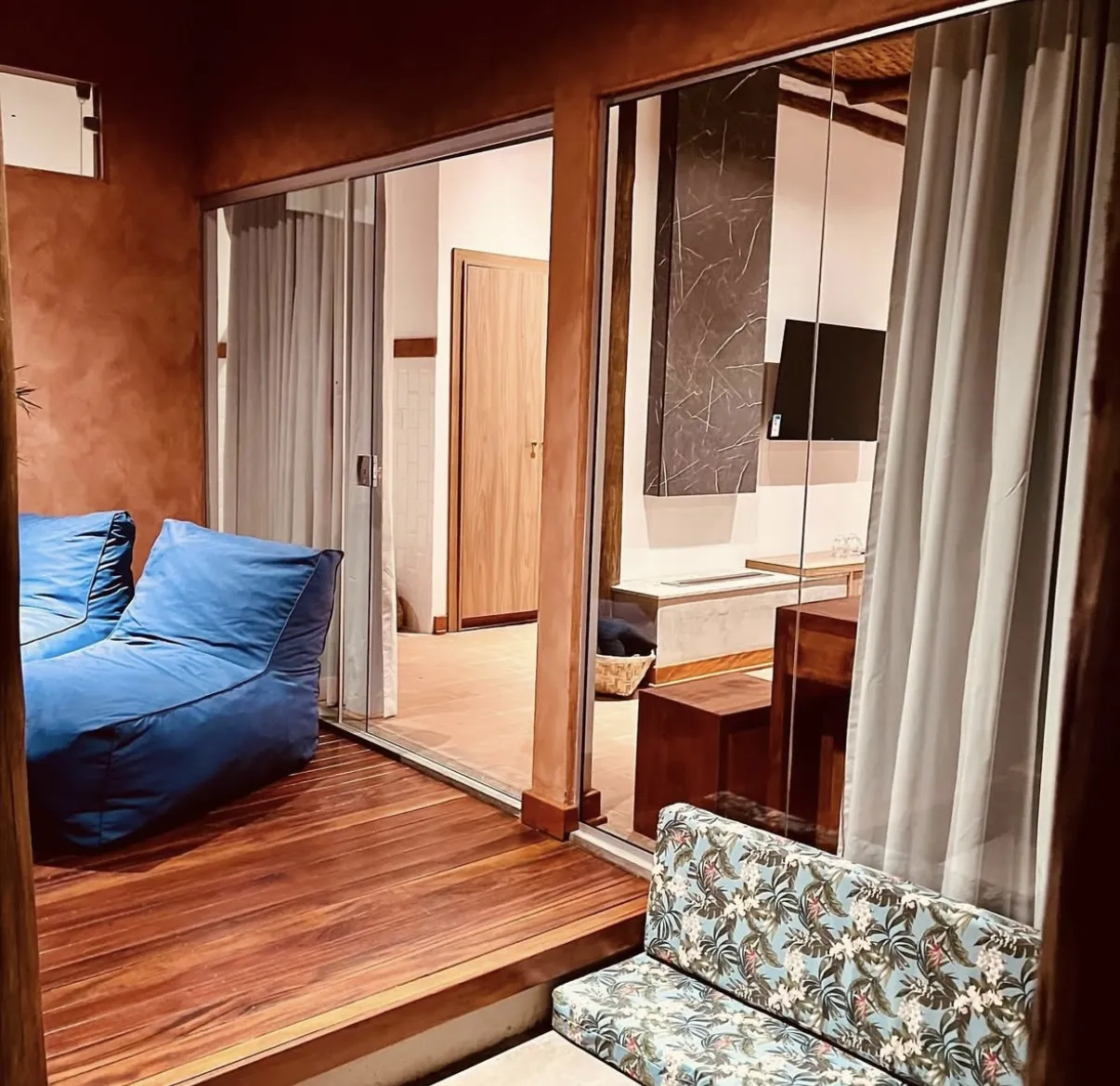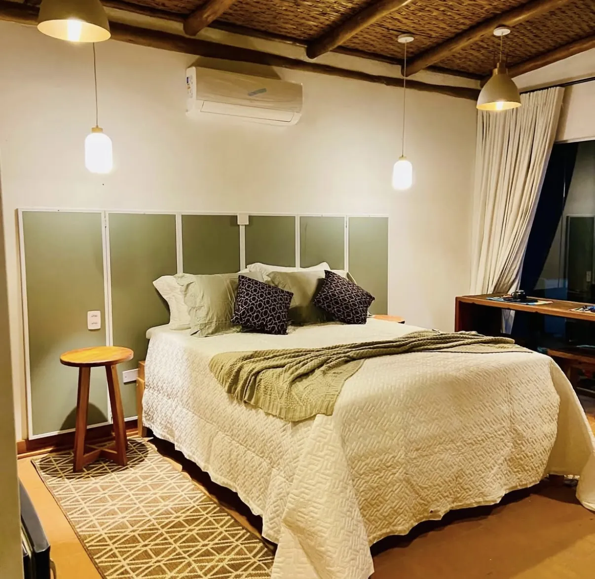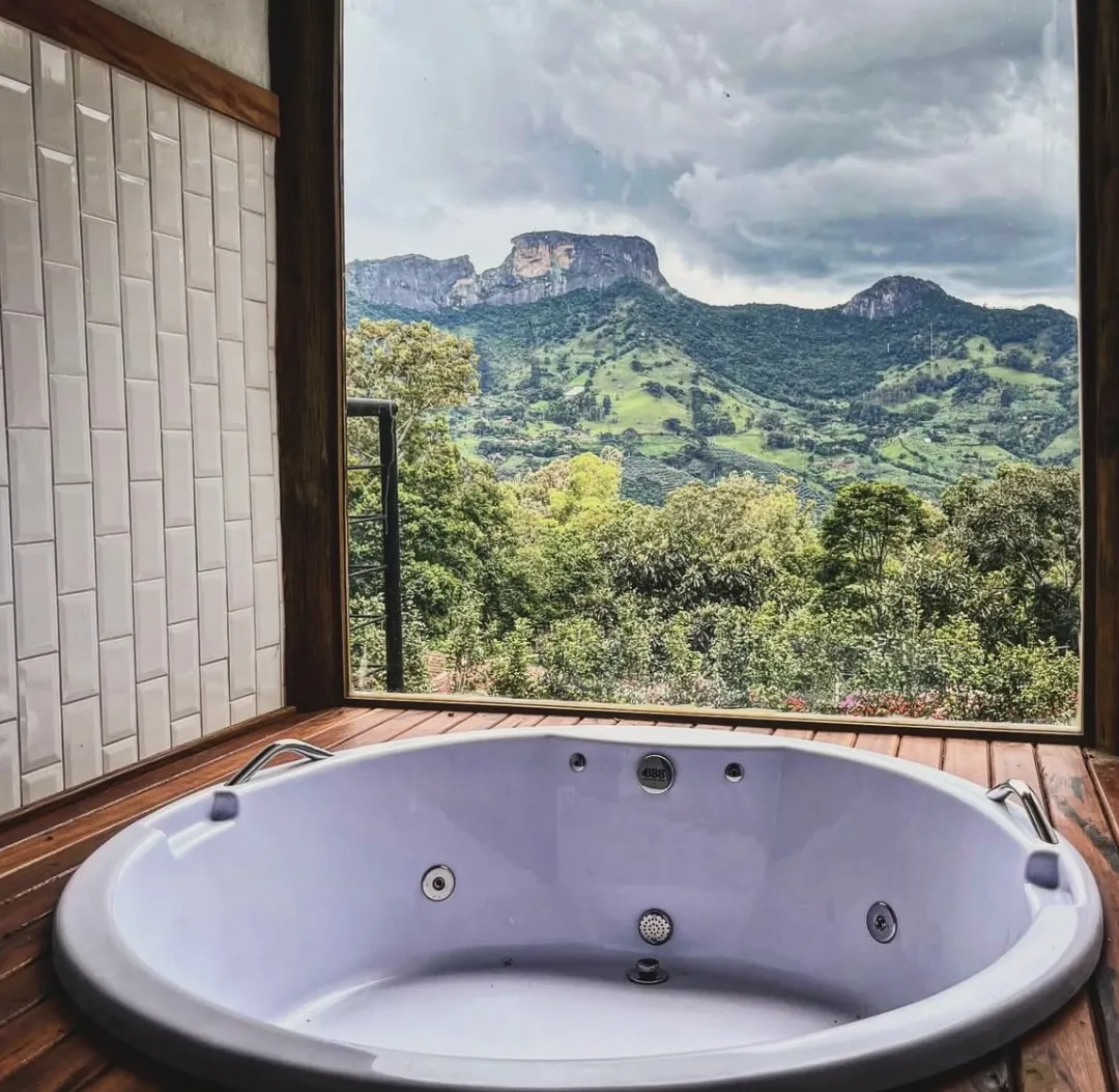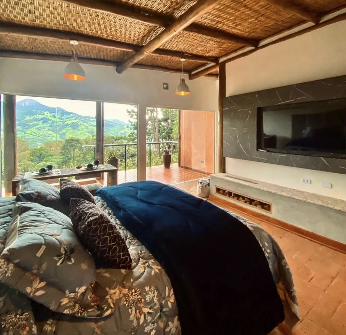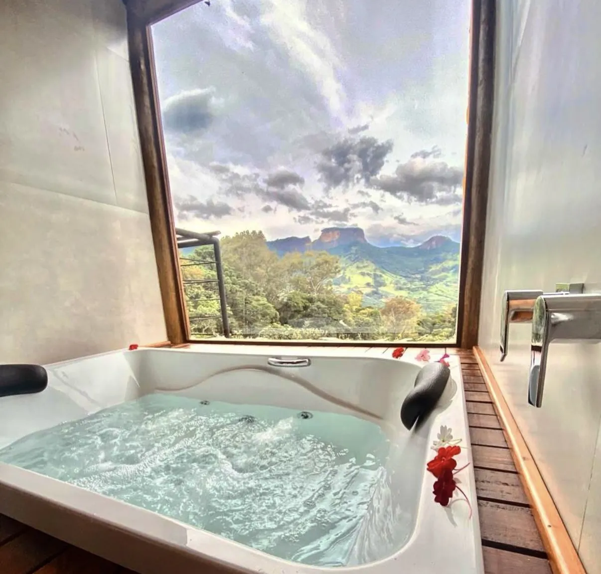 Espaço privativo para casal, cozinha completa, máquina de café, banheira com hidro, lareira ecológica, lareira externa, ar quente e frio, frigobar, roupas de cama, mesa e banho completo .
