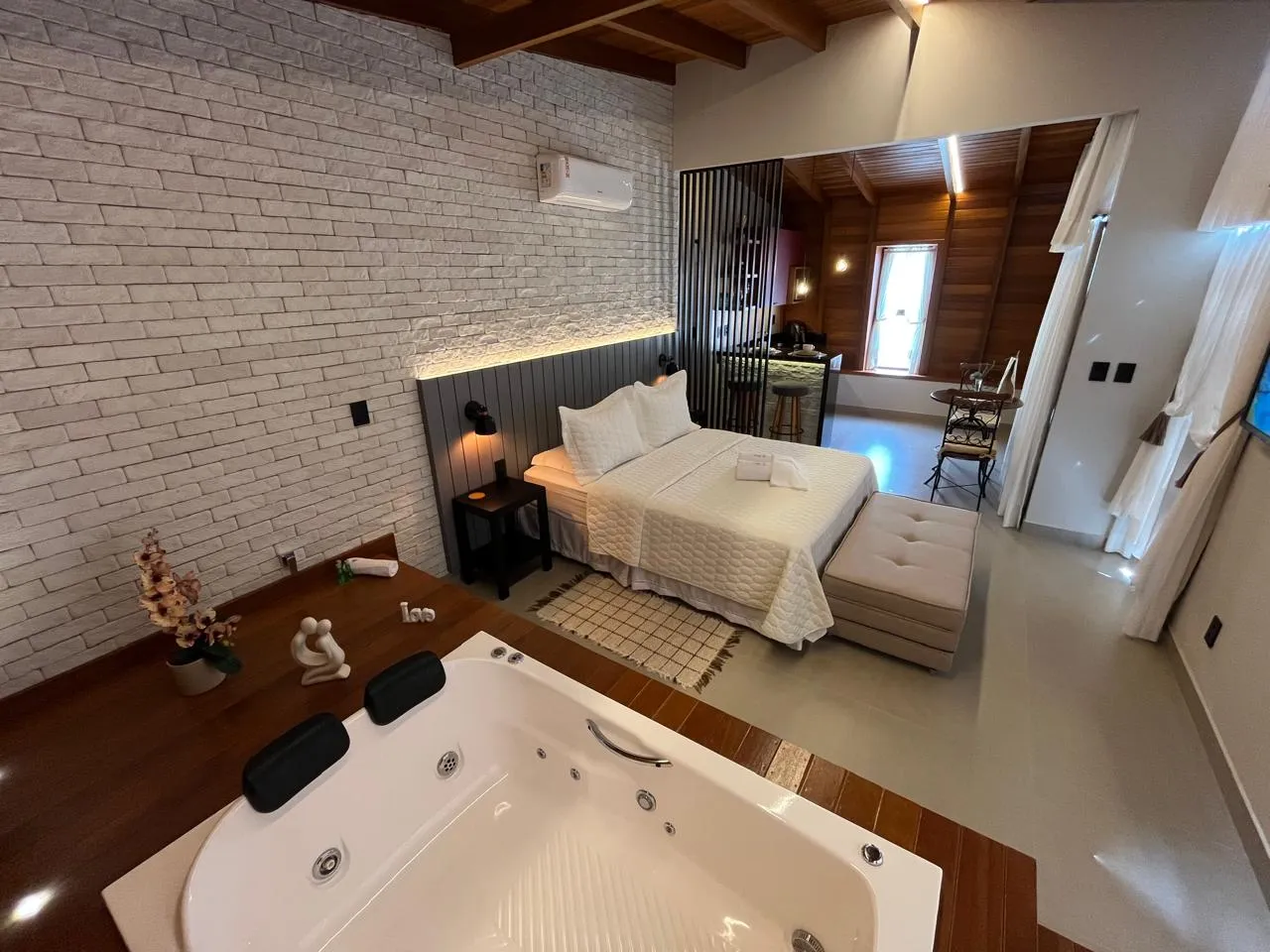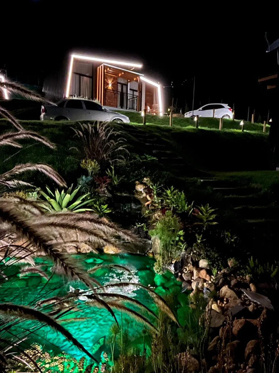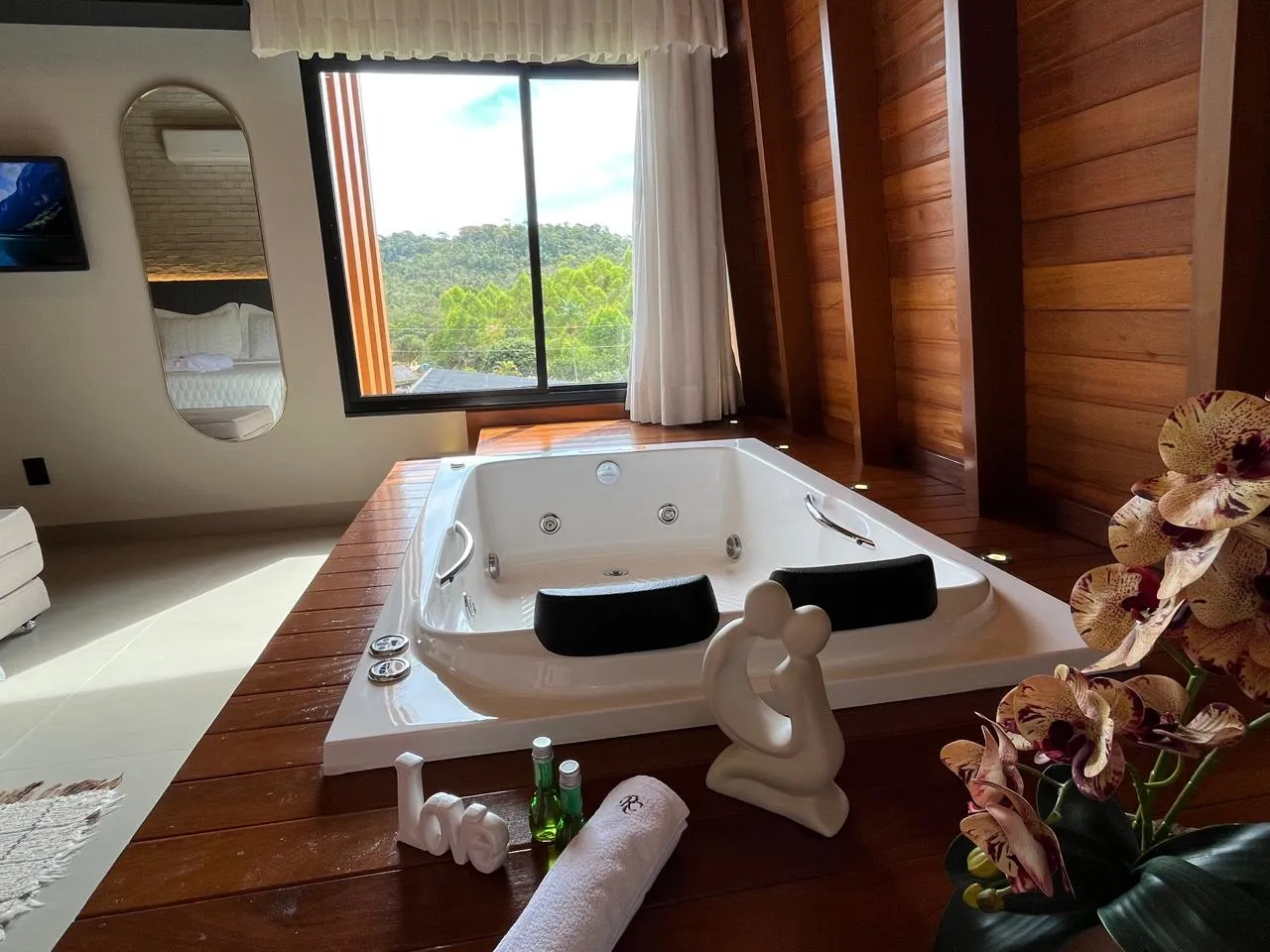 Nosso espaço oferece 4 cabanas de alto padrão, com telhado termoacústico, recém inauguradas e finamente decoradas, todas com banheira de hidromassagem dupla e cromoterapia, cama queen size, enxoval completo, amenities de extrema qualidade, espuma de banho, roupões, TV Smart 32” com Netflix, Wi-Fi, ar condicionado quente e frio, torneiras com água aquecida, secador de cabelo, lareira externa, fechadura eletrônica.