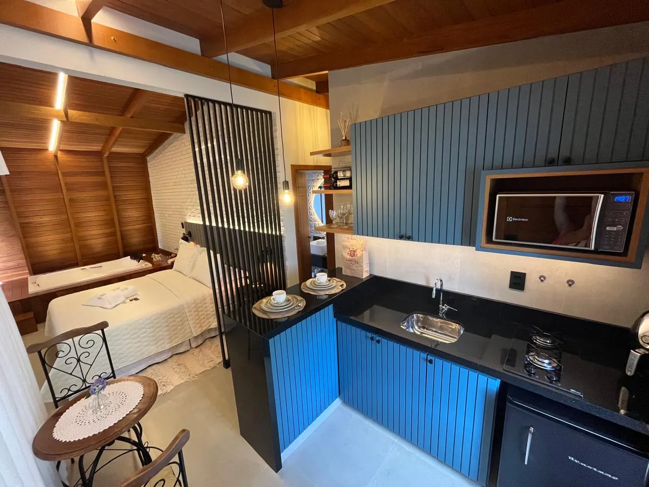 Cada cabana dispõe também de uma cozinha gourmet privativa, totalmente equipada para momentos intimistas, com frigobar, microondas, misteira, air fryer, cooktop de 2 bocas com indução a gás, pratos, talheres, xícaras, utensílios de cozinha, taças de espumante, de vinho e de água.
