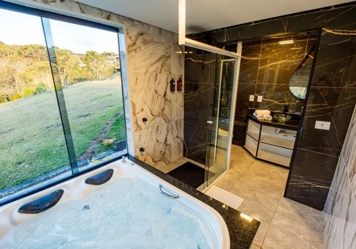 Ar condicionado Secador de cabelo TV a cabo / Smart TV Jacuzzi / Ofurô / Banheira Coberta Frigobar Lareira Máquina de Café Enxoval de Luxo (+ Roupão e Pantufa) Sauna Cozinha Estação de trabalho (mesa e cadeira) Piscina Aquecida ou climatizada Borda Infinita Coberta