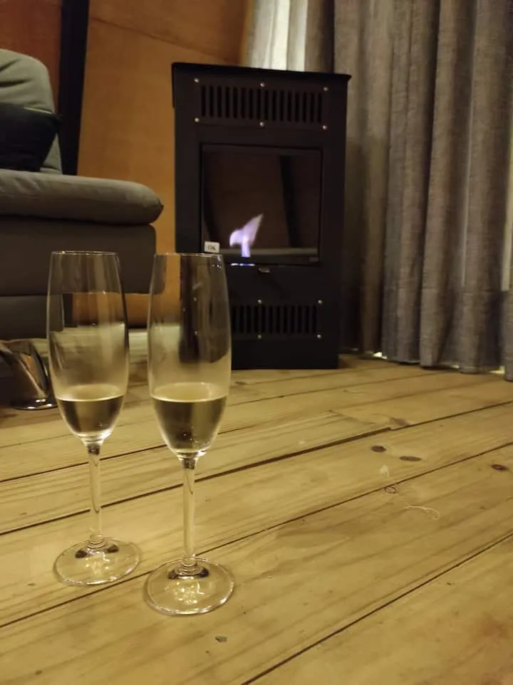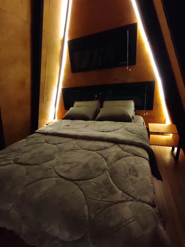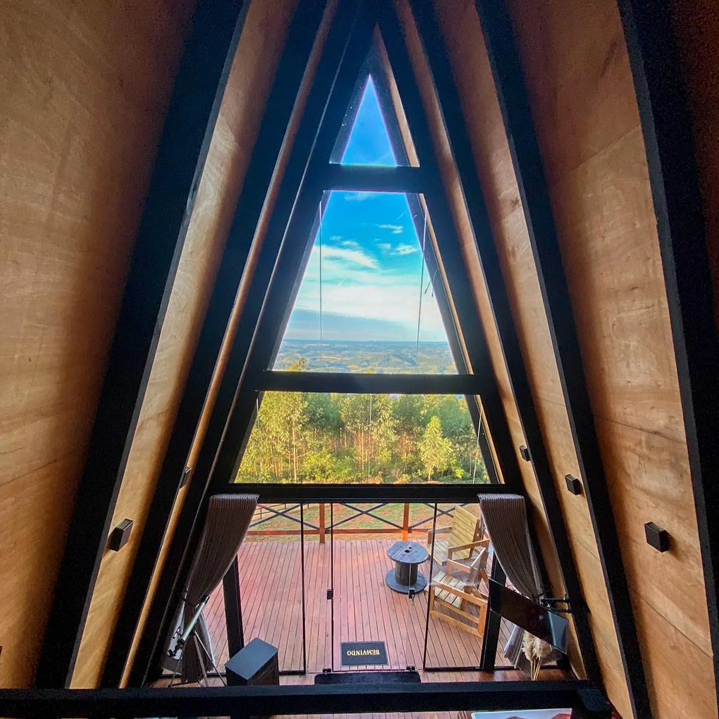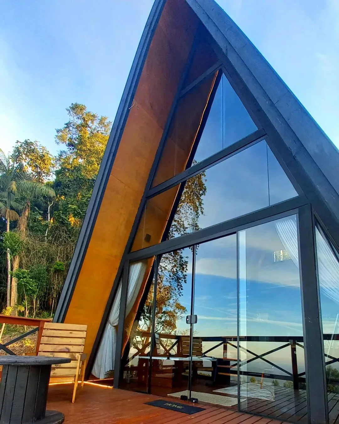 A cabana em estilo A-frame foi construída com materiais da região e dispõe de cozinha completa, sala de estar com lareira a combustão, banheira de hidromassagem com vista para o vale e deck privativo com panorama aberto, que em dias claros permite avistar o mar. Cada detalhe foi pensado para oferecer uma experiência intimista, sofisticada e memorável em meio à natureza.