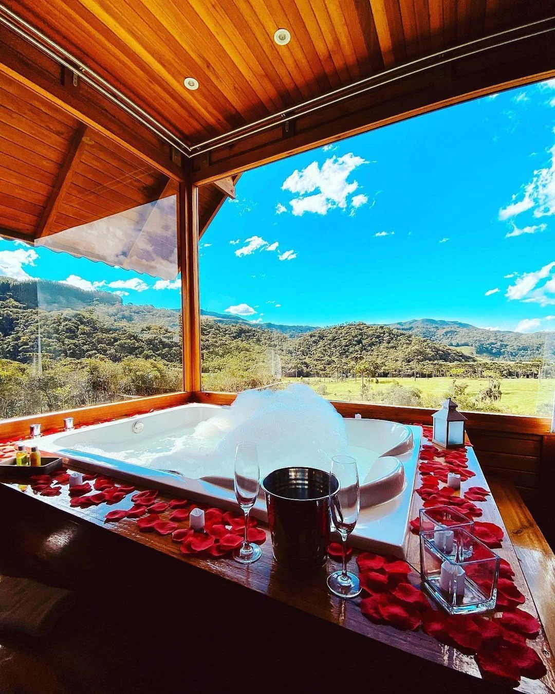 As cabanas são equipadas com: ar-condicionado, TV a cabo, wi-fi, roupas de cama, toalhas de banho, banheira de hidromassagem, cozinha completa, café da manhã, chuveiro à gás, lareira interna, deck externo, gazebo, fogo de chão e balanço do infinito.