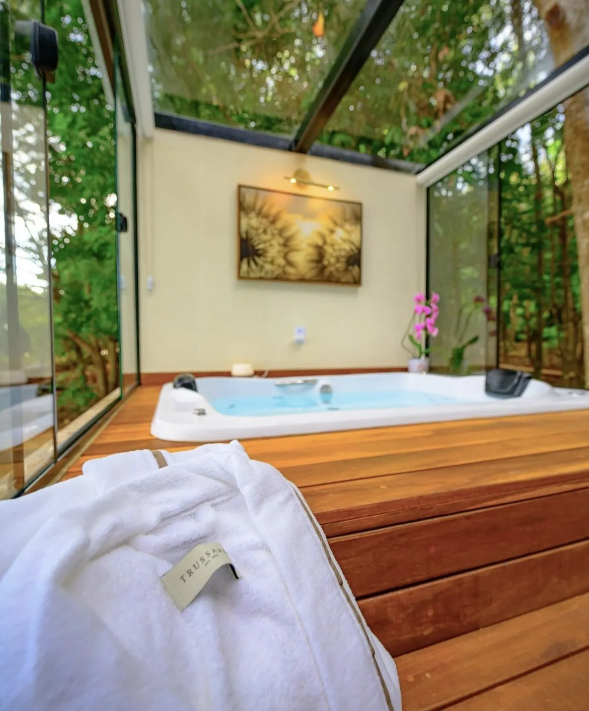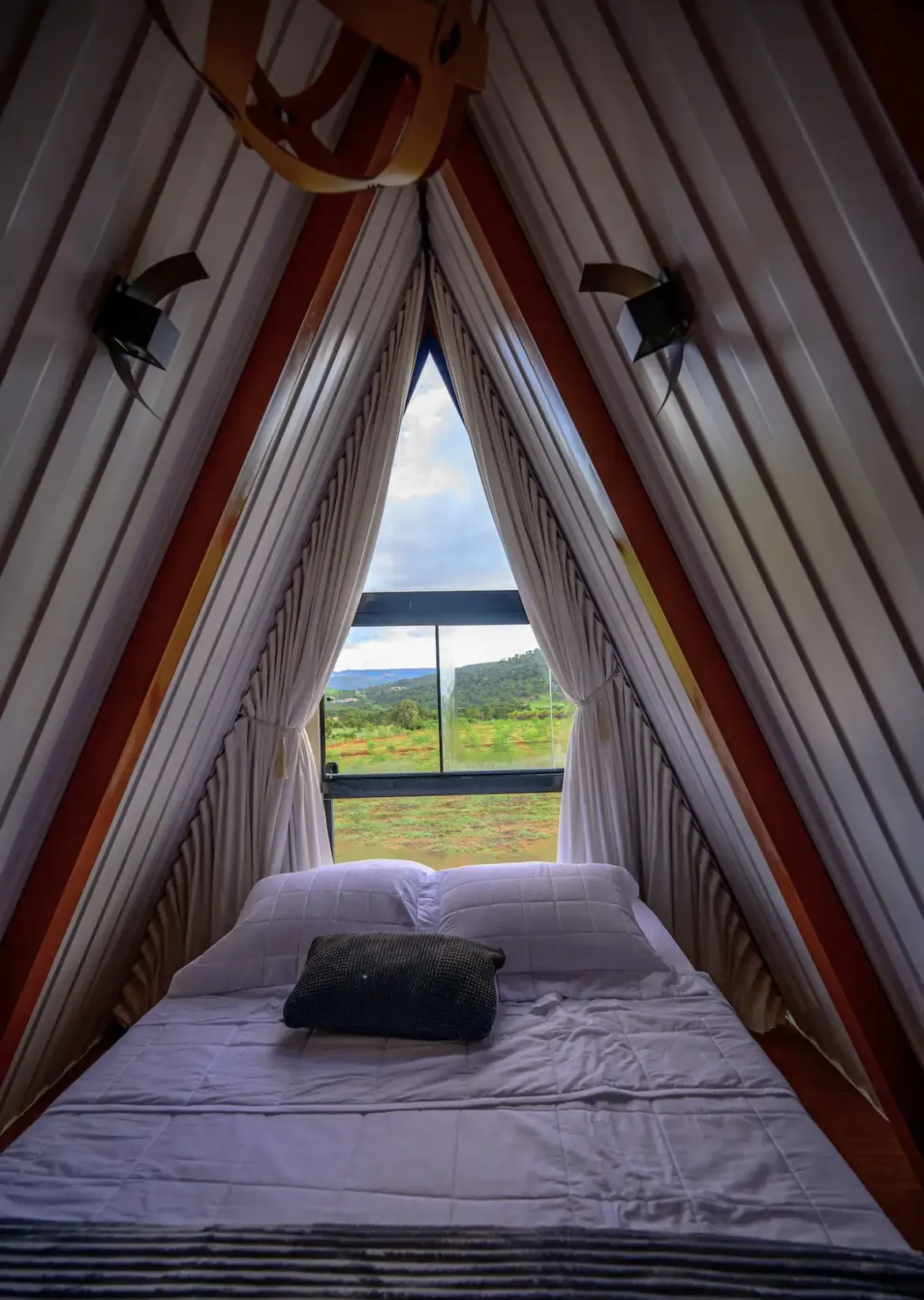 A decoração da Cabana Zurique é meticulosamente planejada para proporcionar um ambiente sofisticado e confortável. Acomode-se em uma cama de casal no mezanino, com roupa de cama de fio 300 egípcio, e desfrute de toalhas e roupões de alta qualidade. O espaço é equipado com smart TV e ar condicionado para seu máximo conforto.