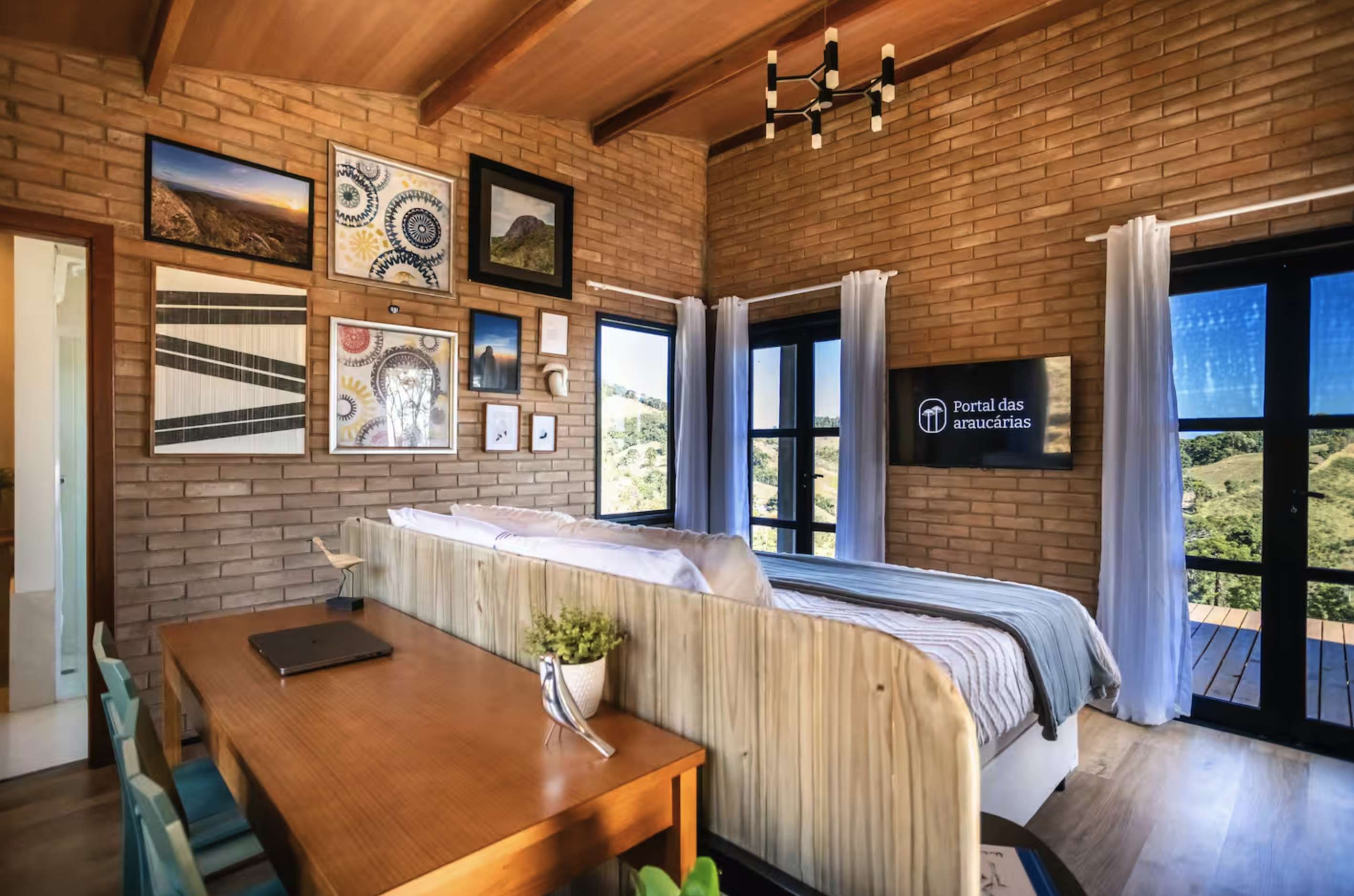 Sinta o clima fresco da serra, desfrute da cozinha equipada, do cantinho de leitura e da sala aconchegante com mezanino.