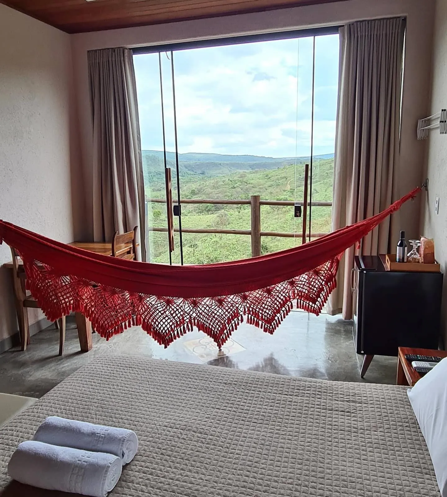Todos os espaços foram projetados para que os hóspedes possam descansar, relaxar e apreciar a bela vista para as montanhas.