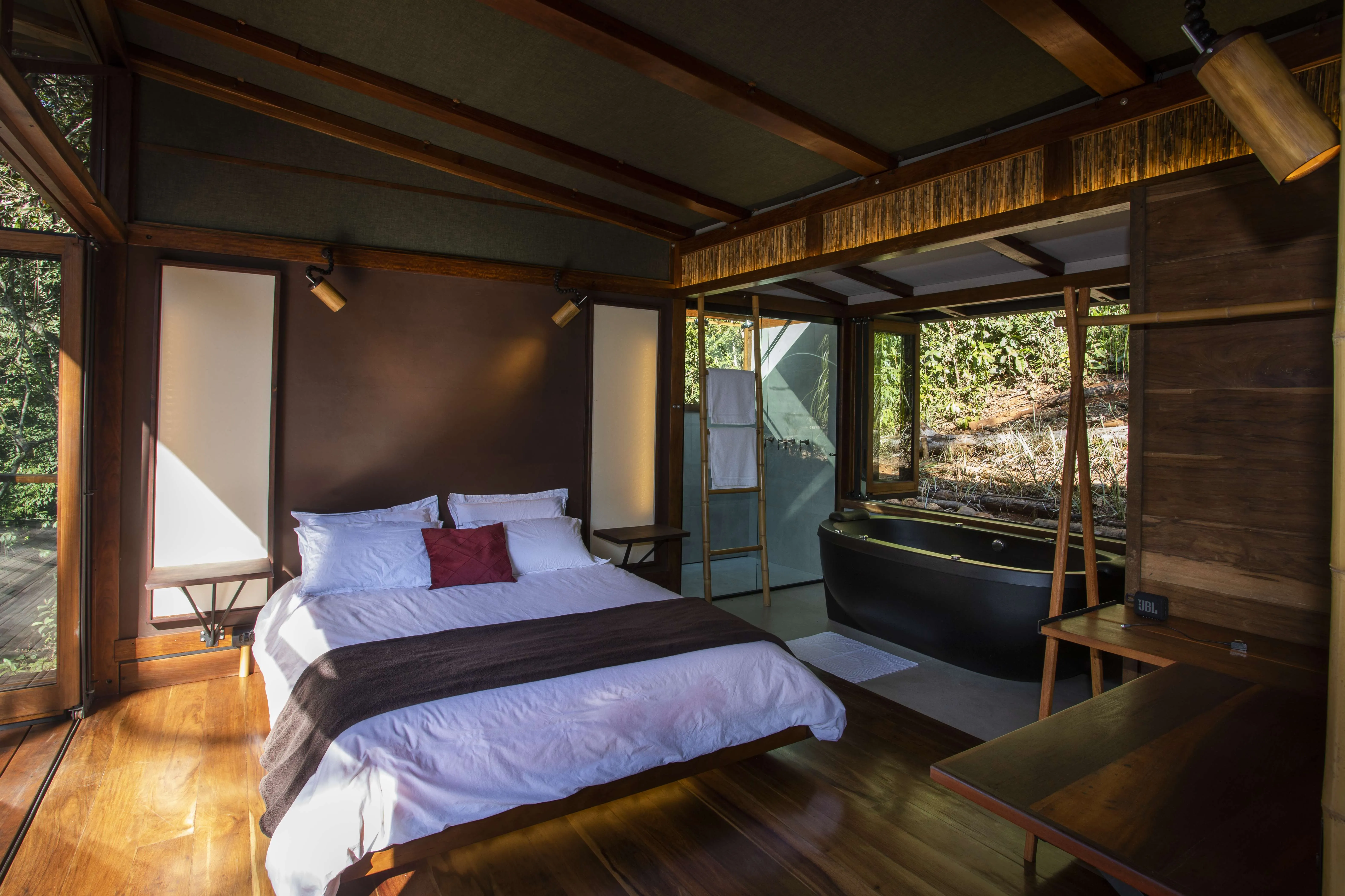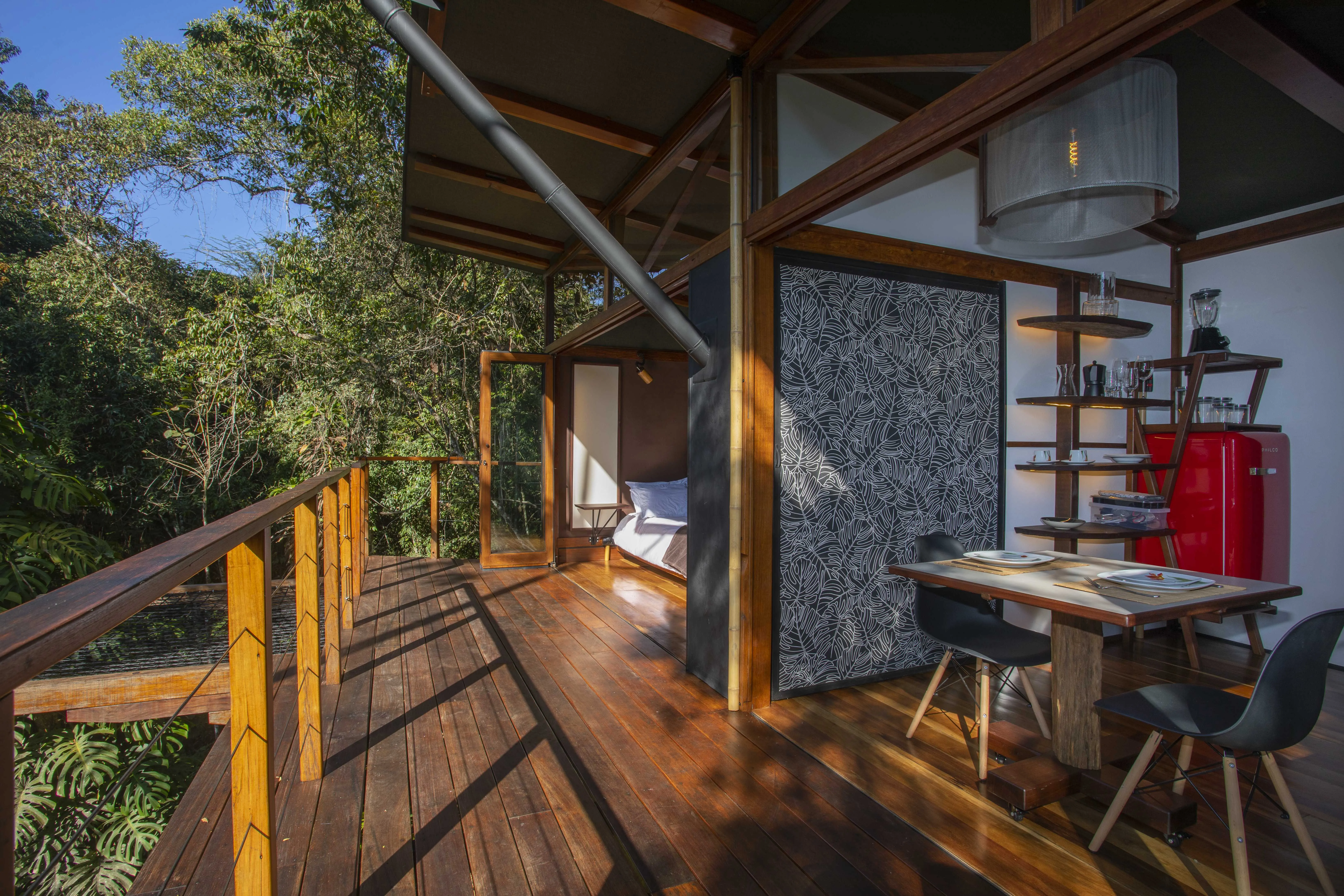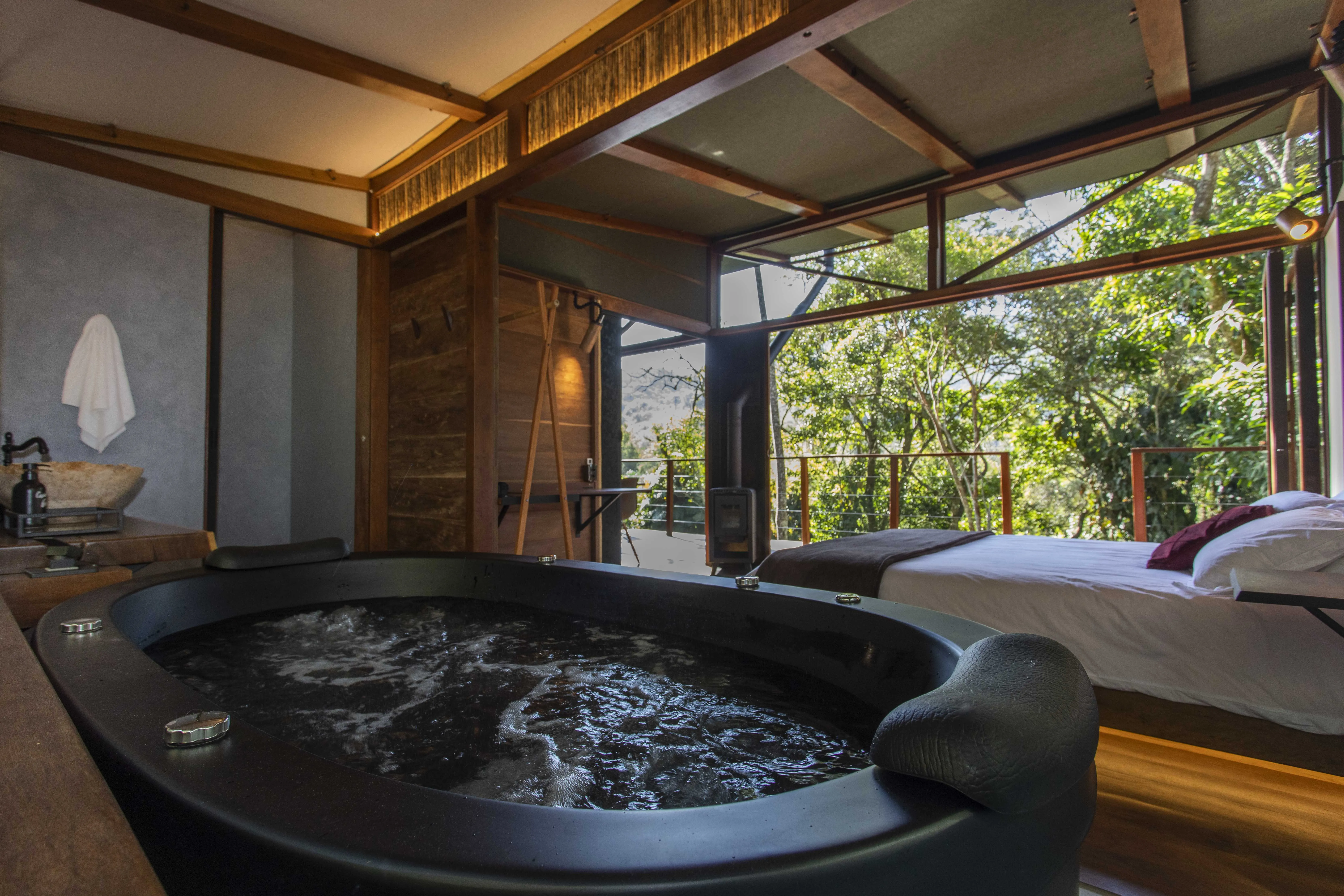 A Cabana Observatório oferece uma experiência única em meio à natureza, unindo conforto, charme e conexão com o ambiente ao redor. Projetada com madeiras de demolição, ipê e fibras naturais, proporciona uma atmosfera acolhedora, sofisticada e funcional. As portas camarão ampliam os espaços e trazem a sensação de estar totalmente integrado à floresta. A rede suspensa se torna o cenário perfeito para contemplar a paisagem, enquanto os chuveiros proporcionam banhos que se transformam em verdadeiros momentos de relaxamento.
