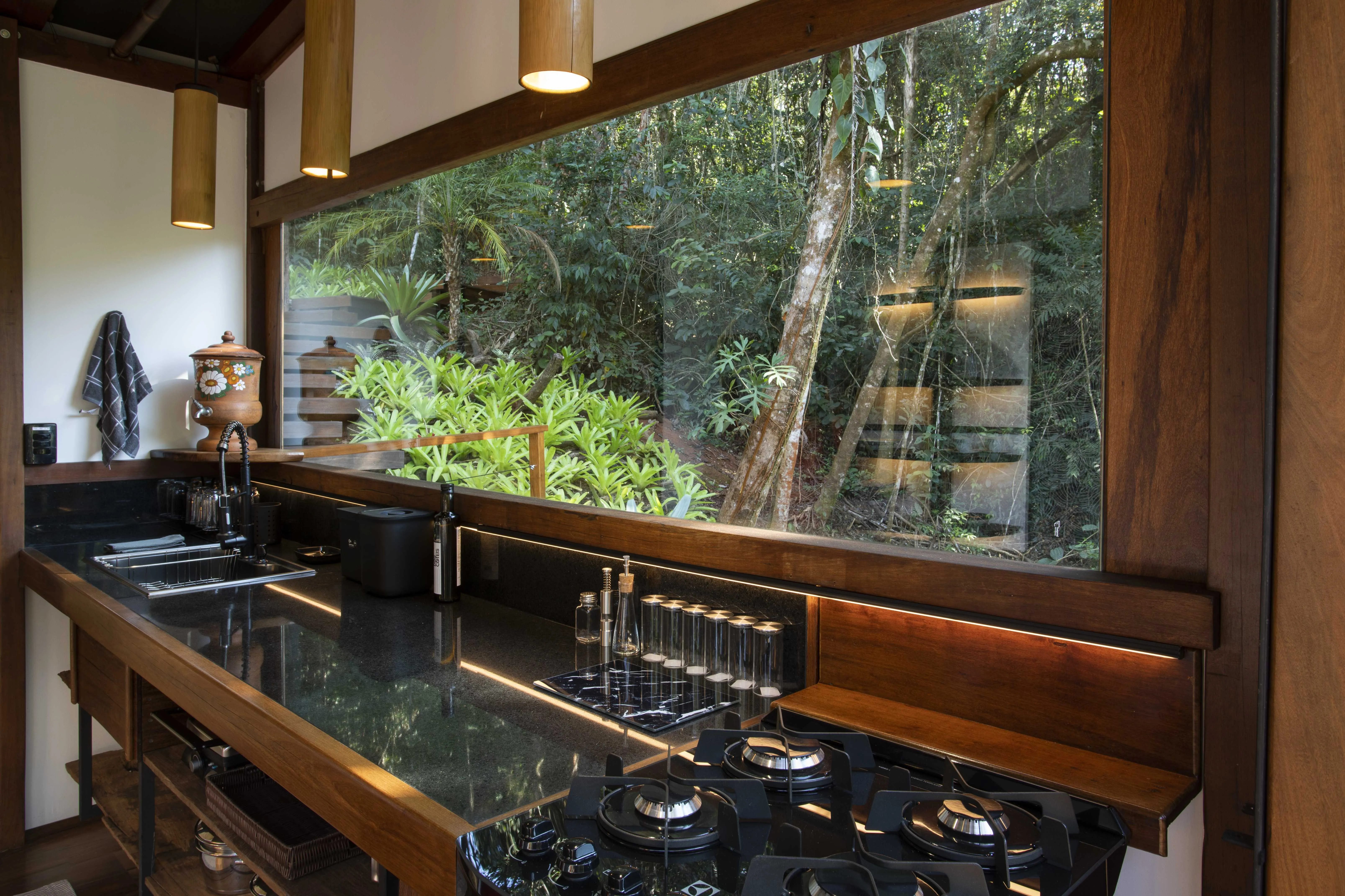 O interior da cabana combina rusticidade e modernidade, com uma cozinha completa, pensada para quem aprecia preparar refeições com praticidade. Cada detalhe foi cuidadosamente planejado para oferecer conforto e bem-estar, desde os ambientes internos aconchegantes até os espaços que convidam à contemplação da natureza. Um refúgio perfeito para quem busca tranquilidade, conexão e experiências inesquecíveis.