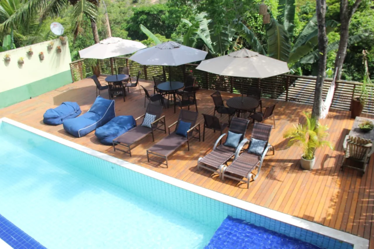 O amplo deck de madeira no entorno da piscina conta com espreguiçadeiras e conjuntos de mesas, cadeiras e ombrelones.