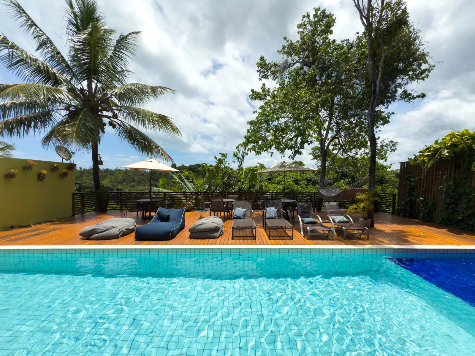 A área comum oferece uma piscina com prainha e diversos bicos de hidro, cercada por amplo deck de madeira debruçado sobre a natureza e as copas de frondosas árvores do Vale dos Gringos com uma infinidade de pássaros, micos e, se der sorte, pode até receber a visita da preguiça que habitualmente vem se alimentar na embaúba, sua árvore preferida.