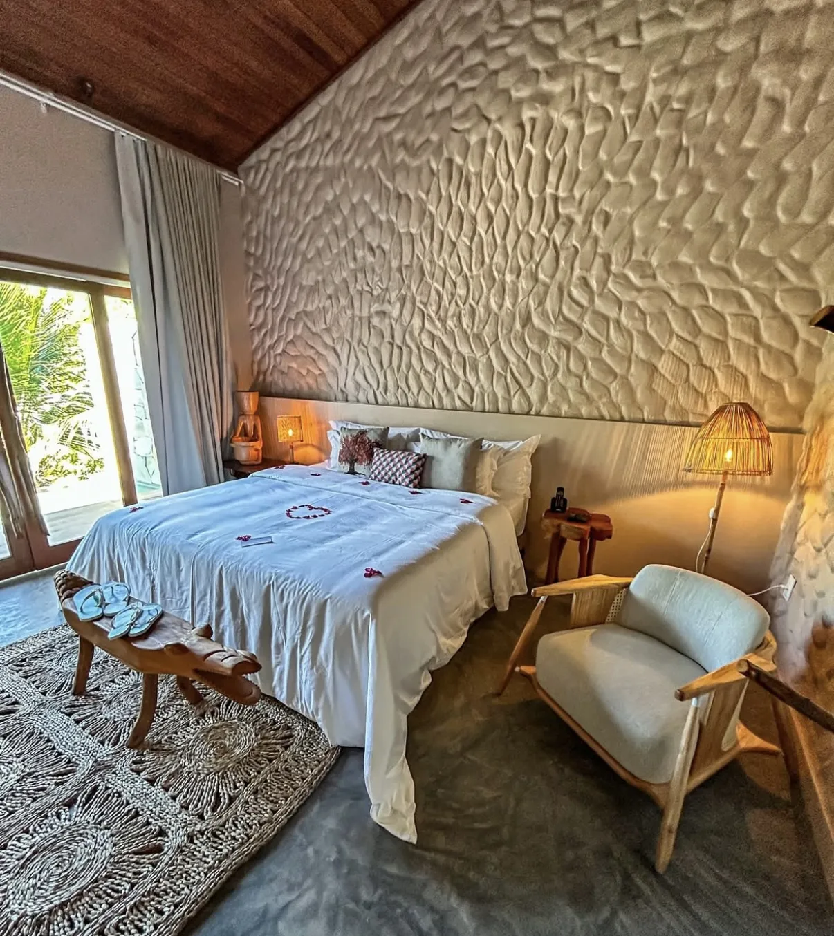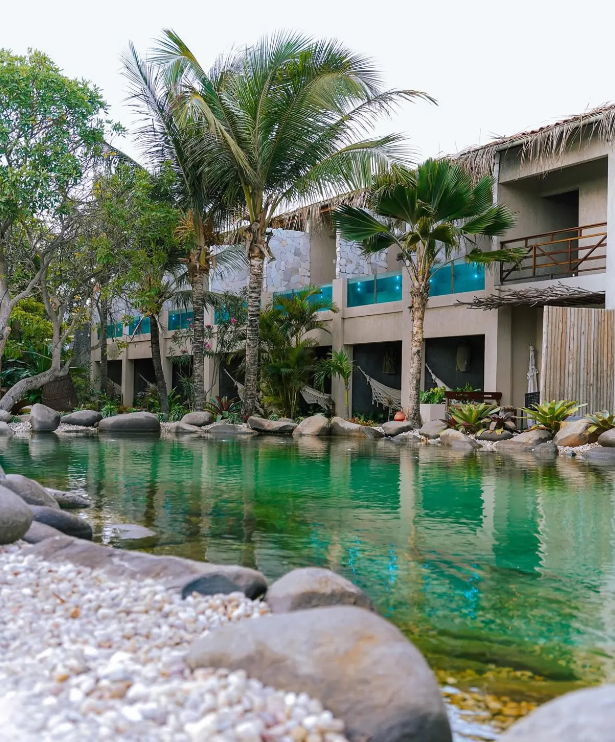 O Villa Pantai Atins se encontra imerso nesse cenário surreal. Uma de suas inspirações é a piscina natural, que une os elementos essenciais deste paraíso: águas claras e fundo de areia, celebrando as lagoas que surgem nos Lençóis. Cada mergulho é uma vivência sensorial provando que ali o corpo se conecta com a alma.