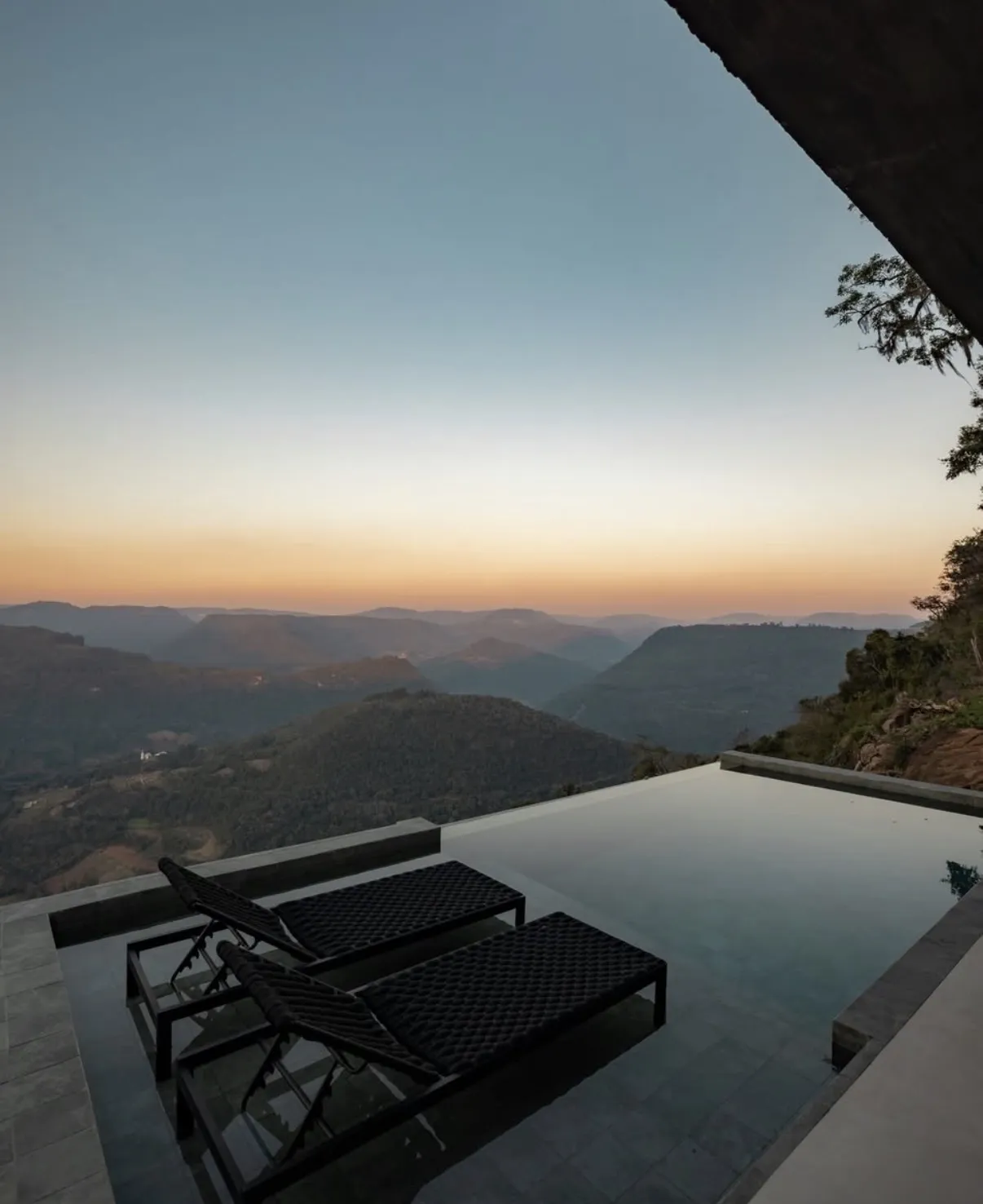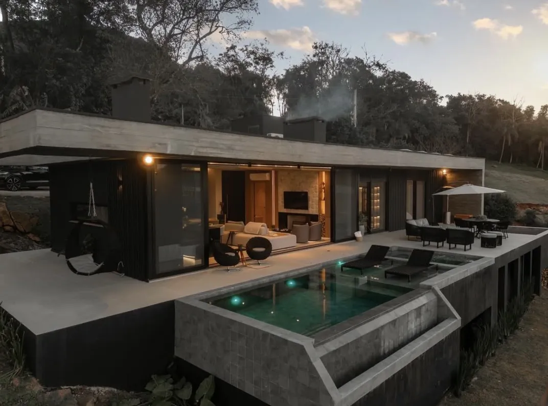 A área externa é um convite ao relaxamento, com piscina de borda infinita, spa aquecido, fireplace, lounge e jardim com horta de temperos e frutíferas. As suítes proporcionam total conforto: duas com cama queen e uma com cama de casal e beliche, todas com ar-condicionado, Smart TV, banheiro com piso e toalheiro aquecidos e vistas encantadoras para o vale ou jardim. Um refúgio que une elegância, conforto e bem-estar em cada detalhe.