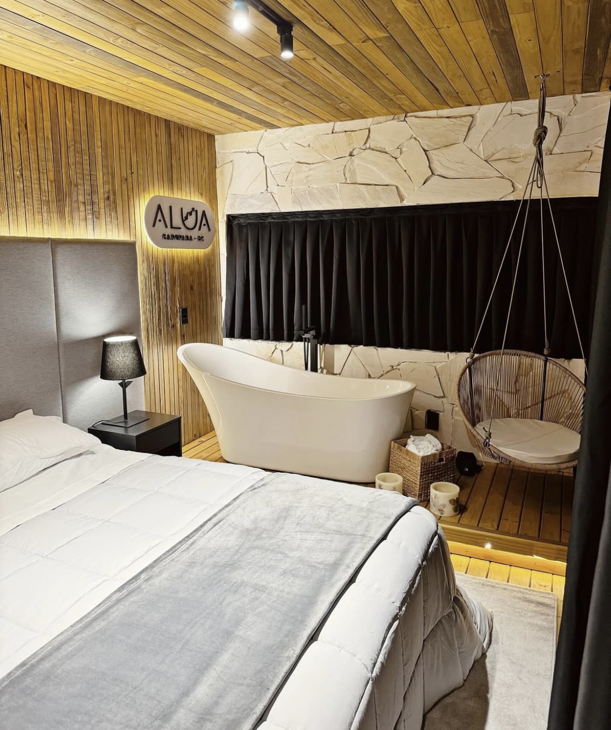 Ar condicionado Secador de cabelo TV a cabo / Smart TV Jacuzzi / Ofurô / Banheira Coberta Frigobar Lareira Máquina de Café Enxoval de Luxo (+ Roupão e Pantufa) Sauna Cozinha Estação de trabalho (mesa e cadeira) Piscina Aquecida ou climatizada Borda Infinita Coberta