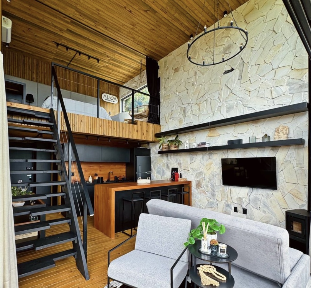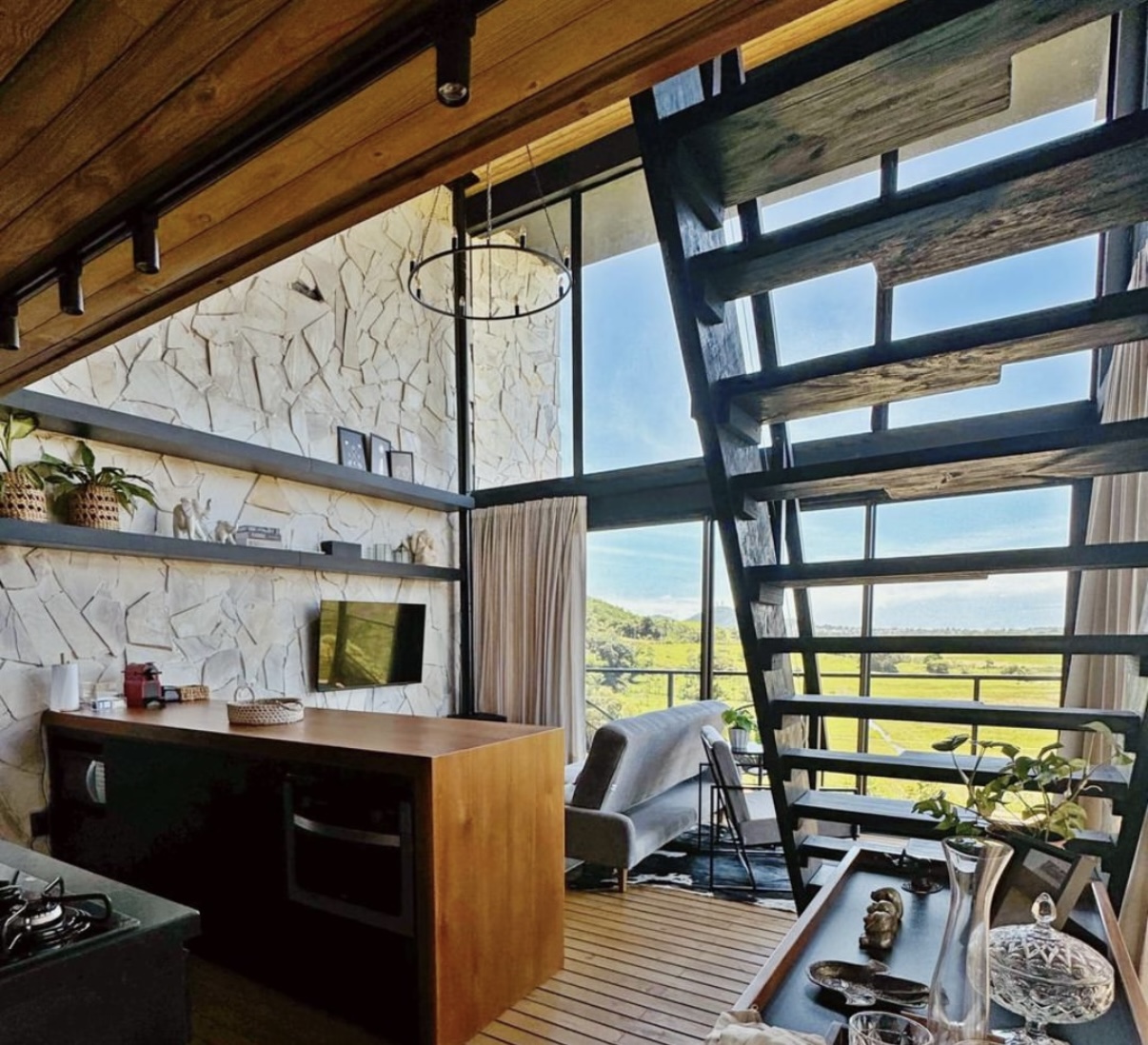 Com uma arquitetura que privilegia o conforto e a conexão com o ambiente, a cabana é cuidadosamente decorada para proporcionar um clima rústico e elegante, ideal para momentos de descanso e contemplação. Janelas amplas e varanda privativa com ofurô revelam vistas espetaculares das montanhas ao redor e da proximidade com o oceano.