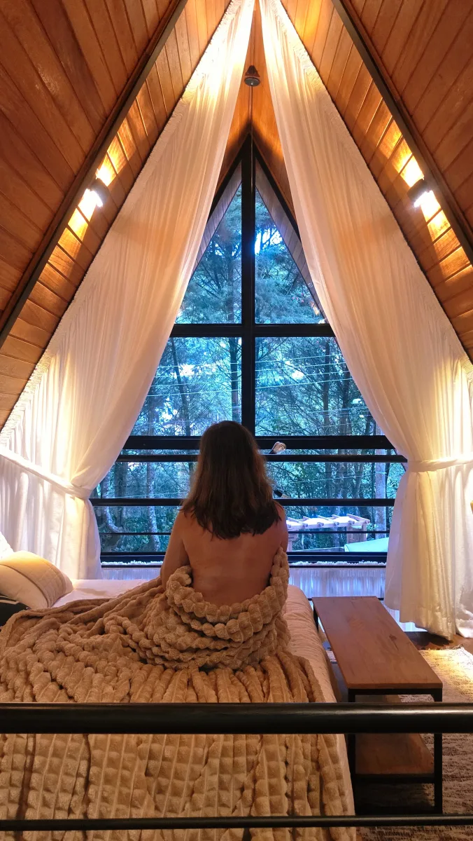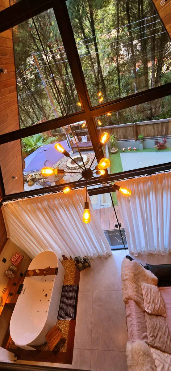 Um espaço envolvente, pensado para momentos marcantes. A banheira de imersão na sala rouba a cena e transforma qualquer estadia em algo especial. Conforto, charme e privacidade em meio ao verde, a poucos minutos do centro.