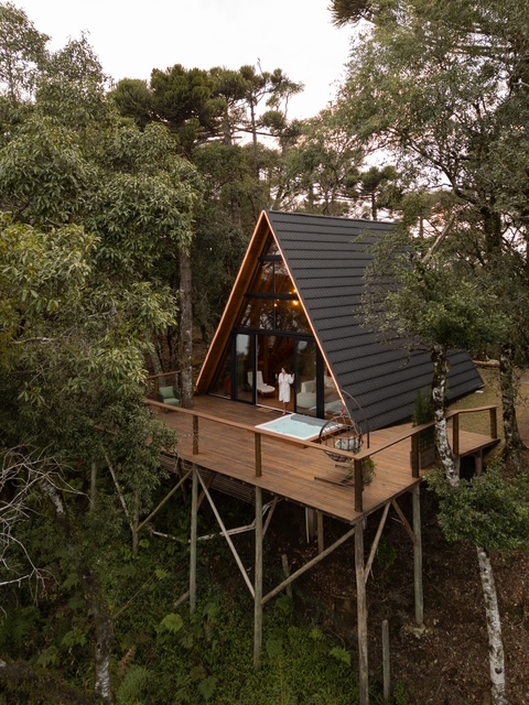 A Cabana Araucária oferece uma experiência exclusiva em meio à natureza, com estrutura de alto padrão e capacidade para até cinco pessoas. Ideal para casais, famílias e amigos que buscam conforto e uma vista deslumbrante das montanhas. Conta com dois quartos, um no primeiro pavimento com cama queen size e outro no mezanino com cama king size, ampla sala de estar, banheiro, lavabo e calefator para os dias frios. O deck possui banheira SPA de hidromassagem e cromoterapia. A cozinha está totalmente equipada, e a região oferece opções gastronômicas e serviços de entrega.