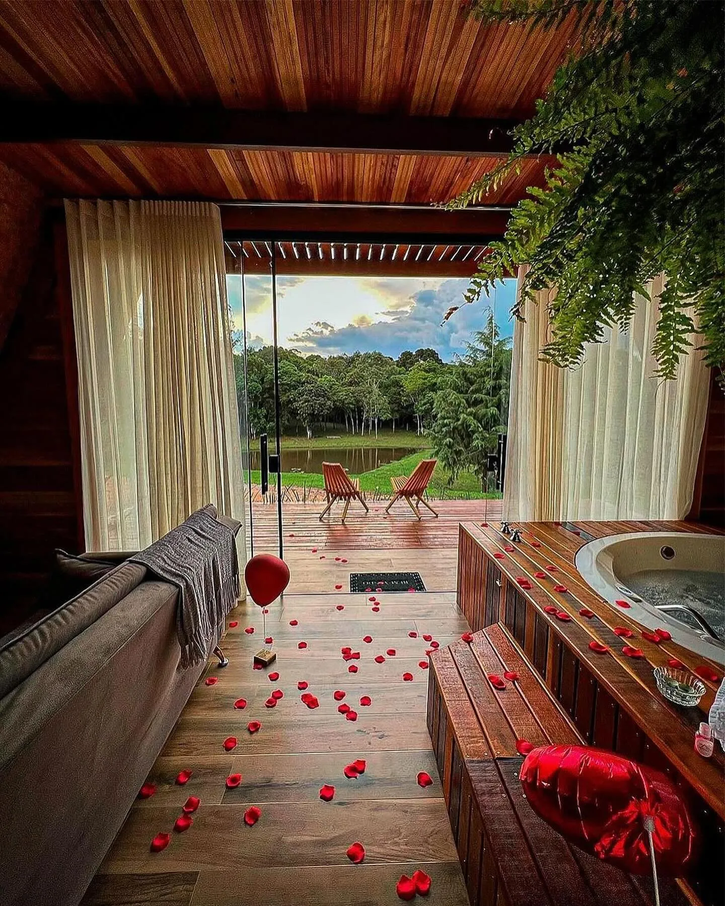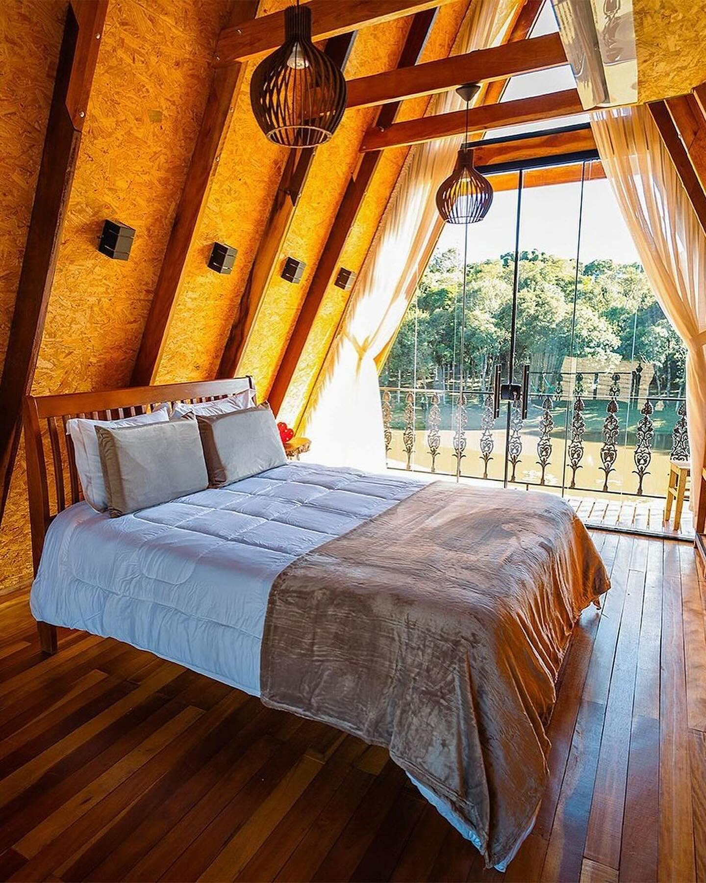 A cabana foi projetada para proporcionar conforto e tranquilidade aos hóspedes, com vista para o lago e um amplo bosque para que possam relaxar e desfrutar da natureza.