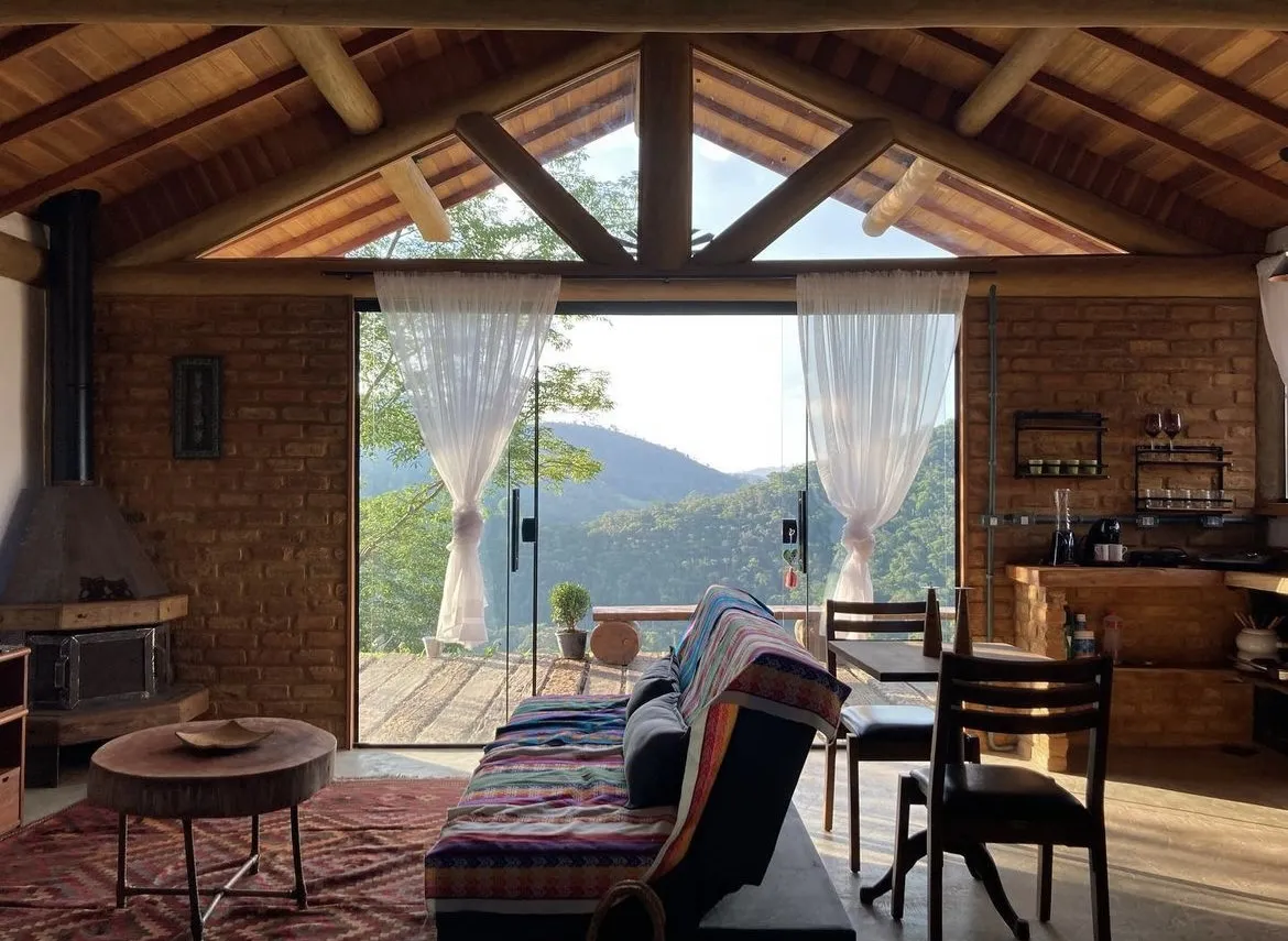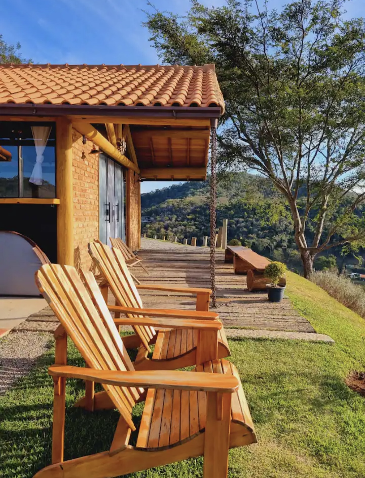 A cozinha está equipada com refrigerador, freezer, forno elétrico, cooktop, cafeteira, chaleira, liquidificador e uma variedade de utensílios essenciais, além de café, açúcar, sal e azeite. Entre outros itens disponíveis, há livros, lanterna e ferro de passar roupa. A área externa conta com deck, bancos, mesa, fogo de chão, churrasqueira e um ofurô à lenha para duas pessoas, com higienização completa a cada estadia. Lenha, álcool e fósforos são fornecidos, e o aquecimento do ofurô pode ser solicitado entre 9h e 16h. O estacionamento é exclusivo para os hóspedes.