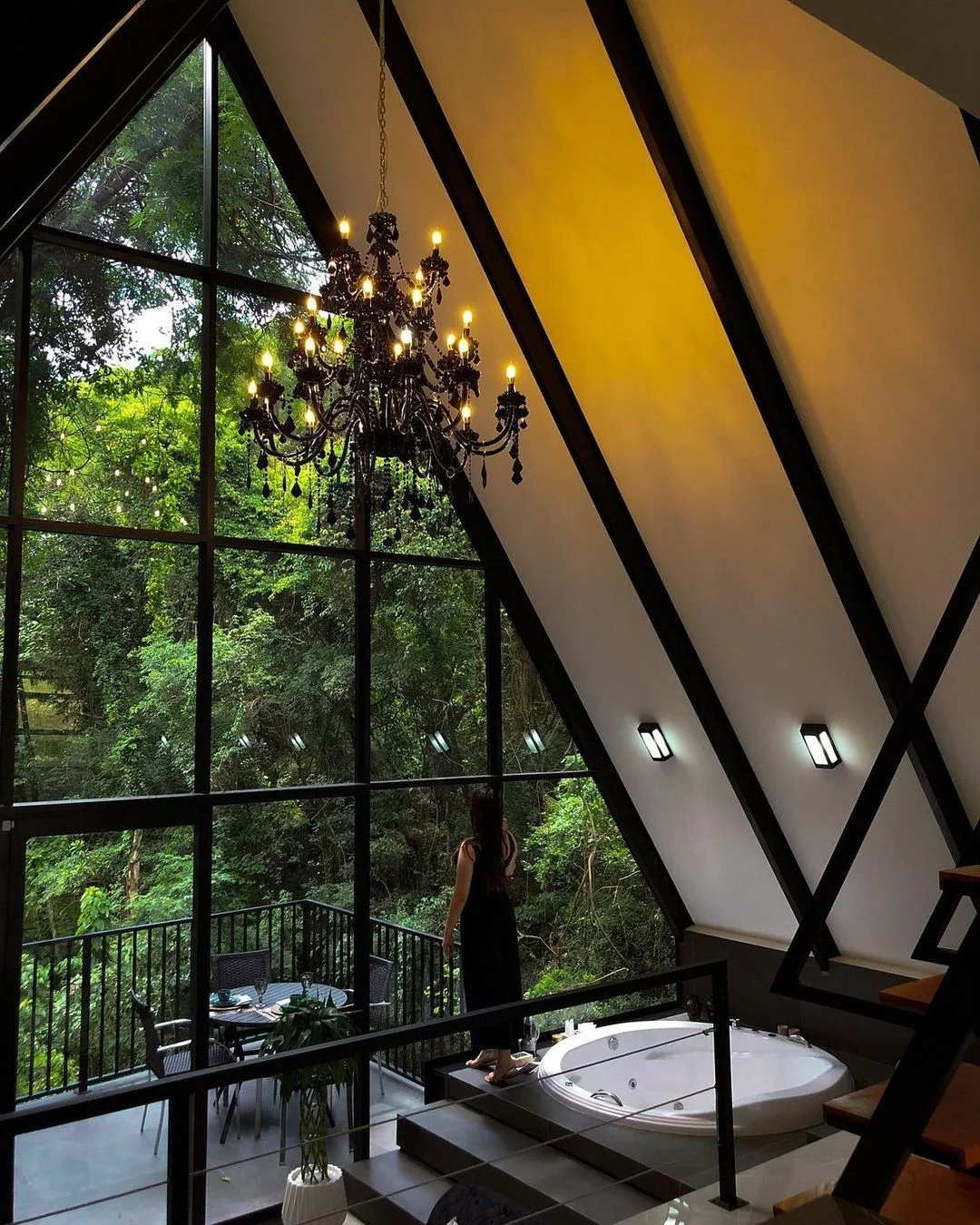 A cabana possui cozinha completa, hidromassagem com vista da mata, ar-condicionado, cama king size, sofá-cama e lareira interna.