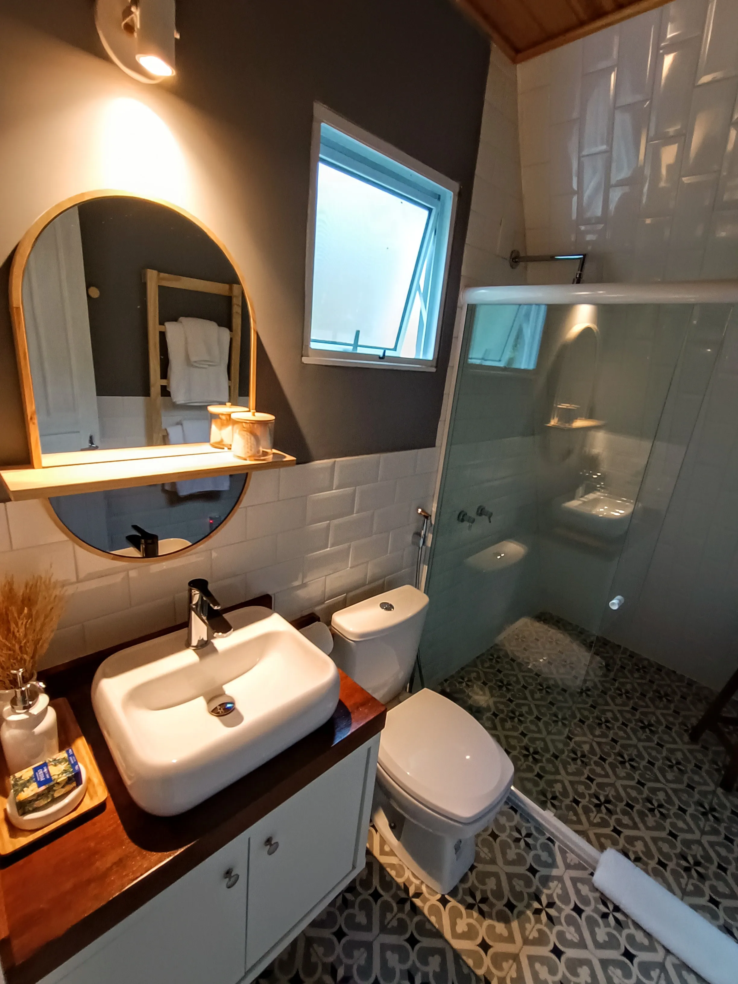 O banheiro caprichosamente decorado tem dimensões generosas e conta com: