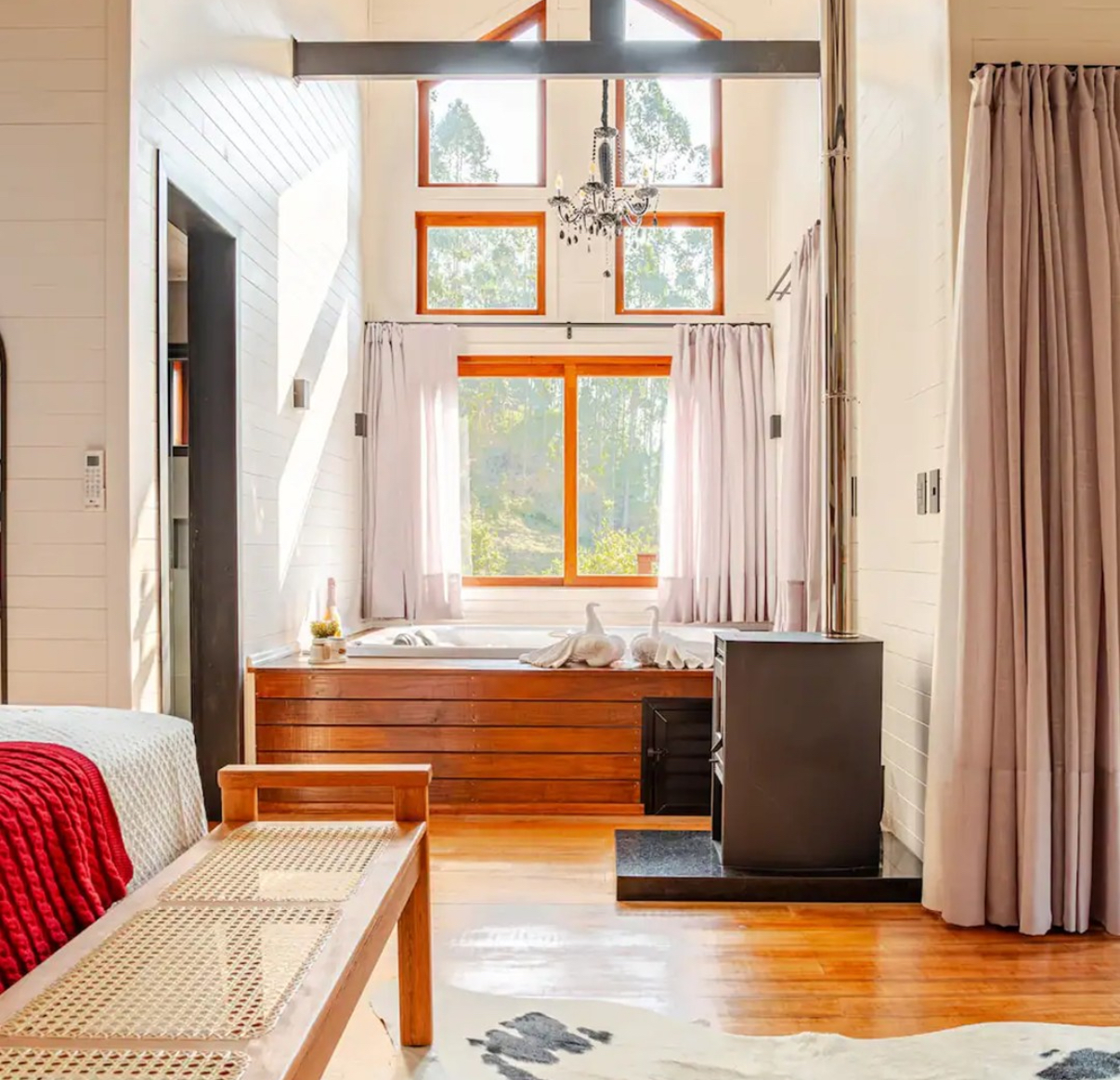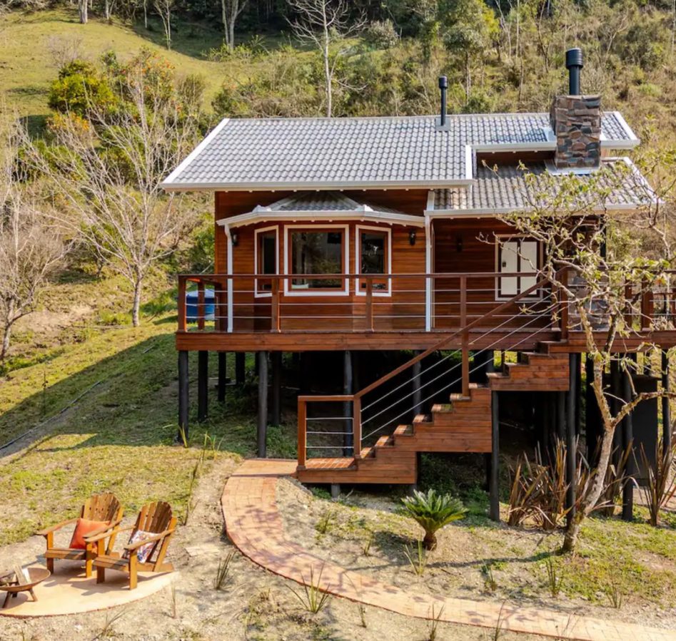 Na área externa, a cabana oferece churrasqueira, varanda aconchegante e um espaço perfeito para relaxar e contemplar o entorno. A estrutura inclui ainda dois chuveiros, enxoval de cama e banho de alto padrão, espuma de banho, rede, além de opções de cestas de café da manhã sob encomenda. Um lugar ideal para viver dias de descanso, romantismo e conexão, cercado pela tranquilidade e beleza da Serra Catarinense.