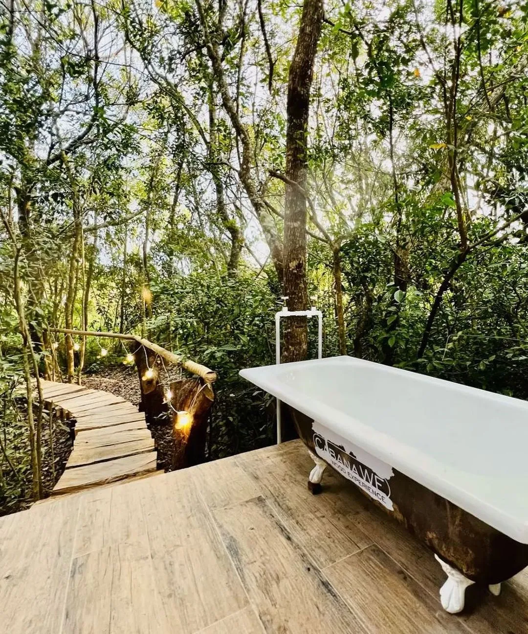 Na área externa, além da churrasqueira suspensa, a cabana oferece uma banheira vitoriana da década de 40 para um banho inesquecível.