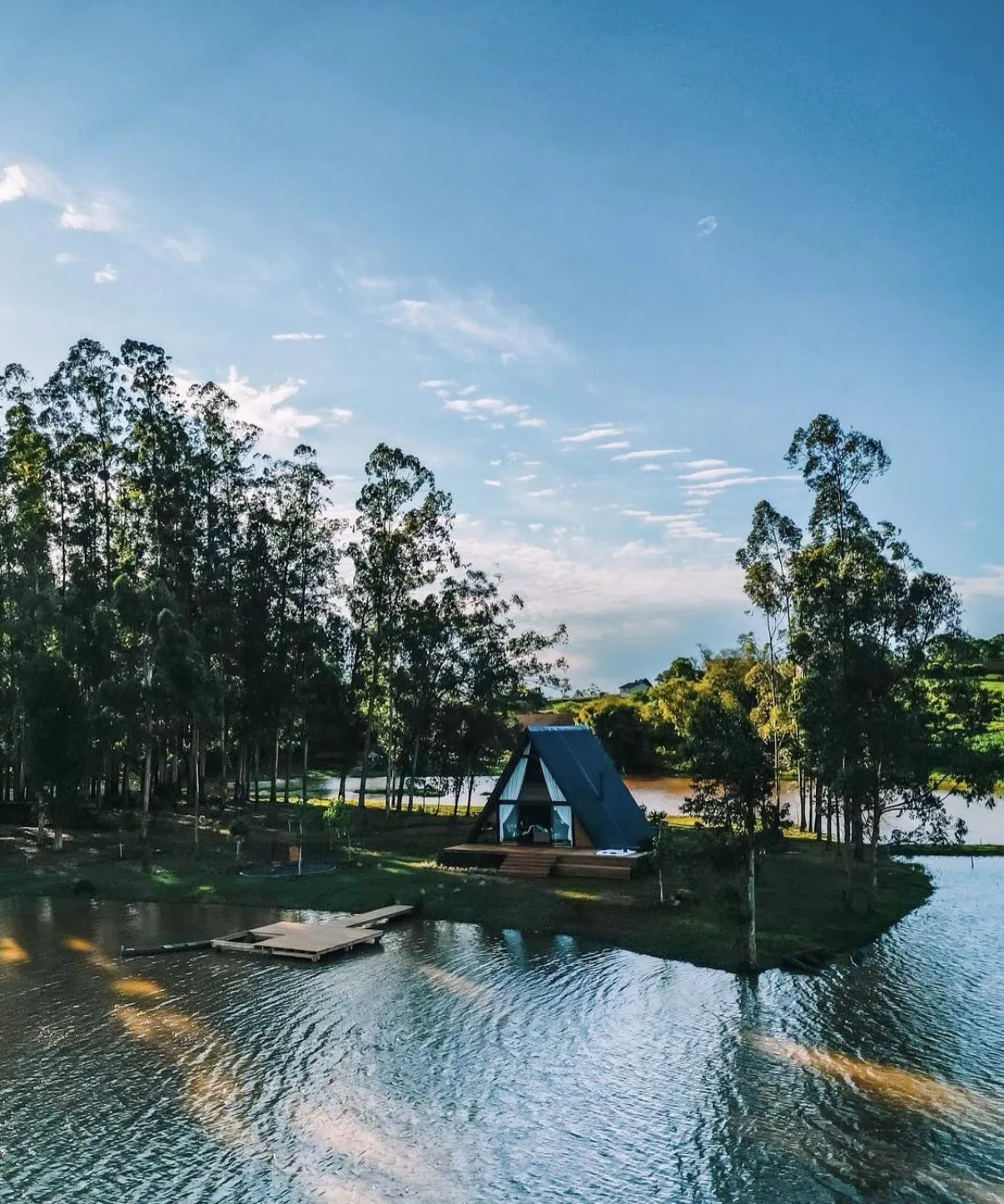 Cabana A-frame em ilha privativa, no centro de um lago de 7 hectares, ideal para quem busca tranquilidade, exclusividade e contato com a natureza. Vista para a água, deck para relaxar e privacidade total.