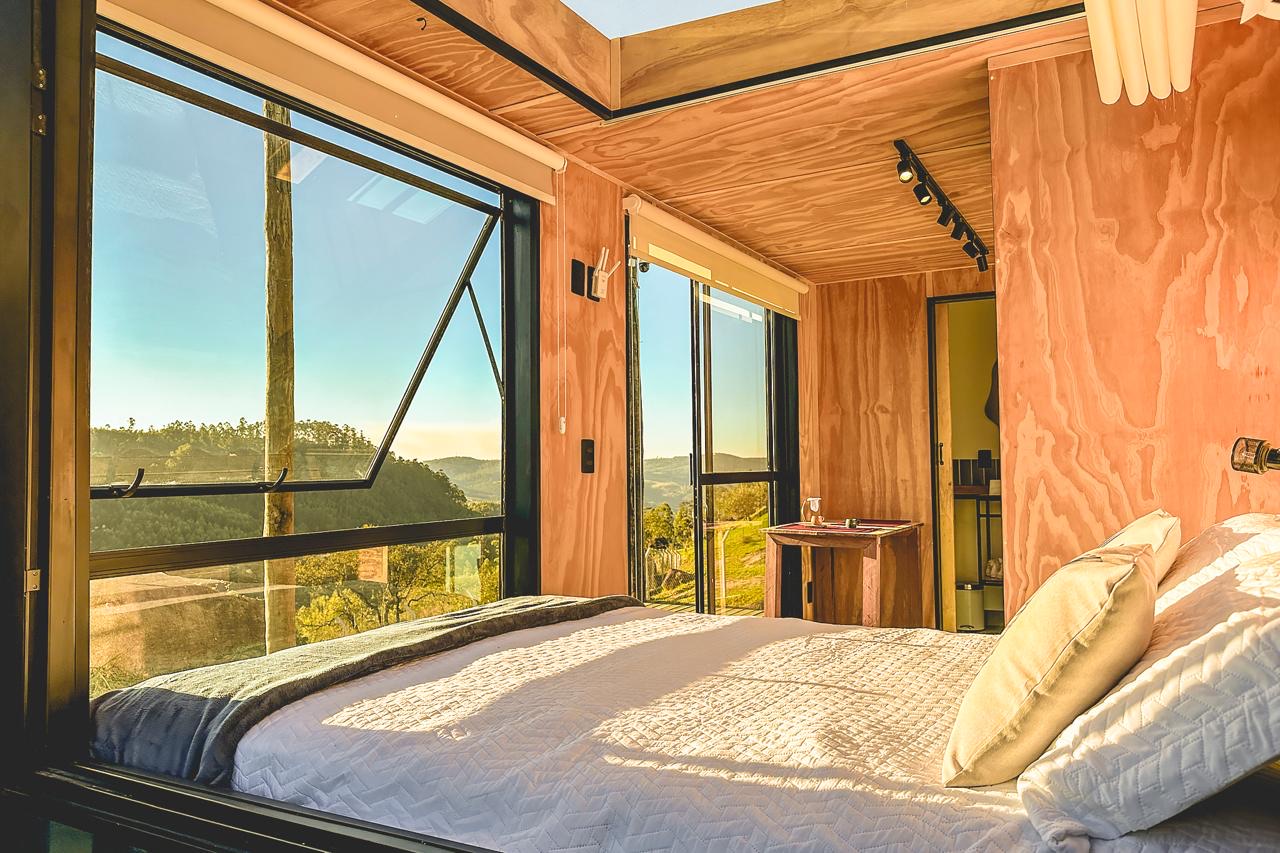 A vista da cabana é para uma floresta e rodeada de montanhas em um local muito seguro.