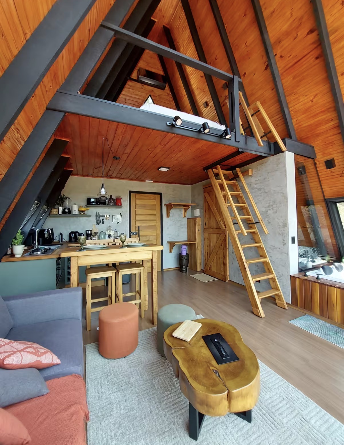O interior apresenta um clima acolhedor e estrutura pensada para o conforto. O dormitório está localizado em um mezanino, acessado por escada em estilo marinheiro, garantindo amplitude ao espaço. Cada detalhe foi planejado para que o hóspede vivencie serenidade e possa se desconectar com qualidade durante toda a estadia.