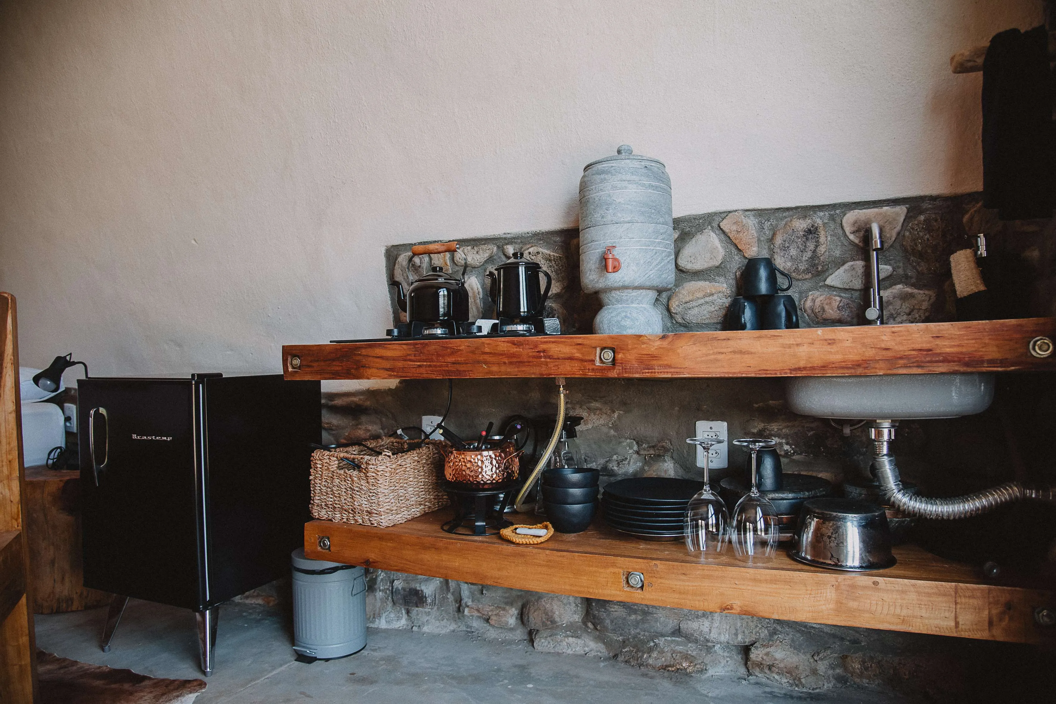 Totalmente off-grid, a cabana oferece energia solar, saneamento ecológico, internet, cozinha equipada, frigobar e lareira, garantindo conforto sem abrir mão da sustentabilidade.