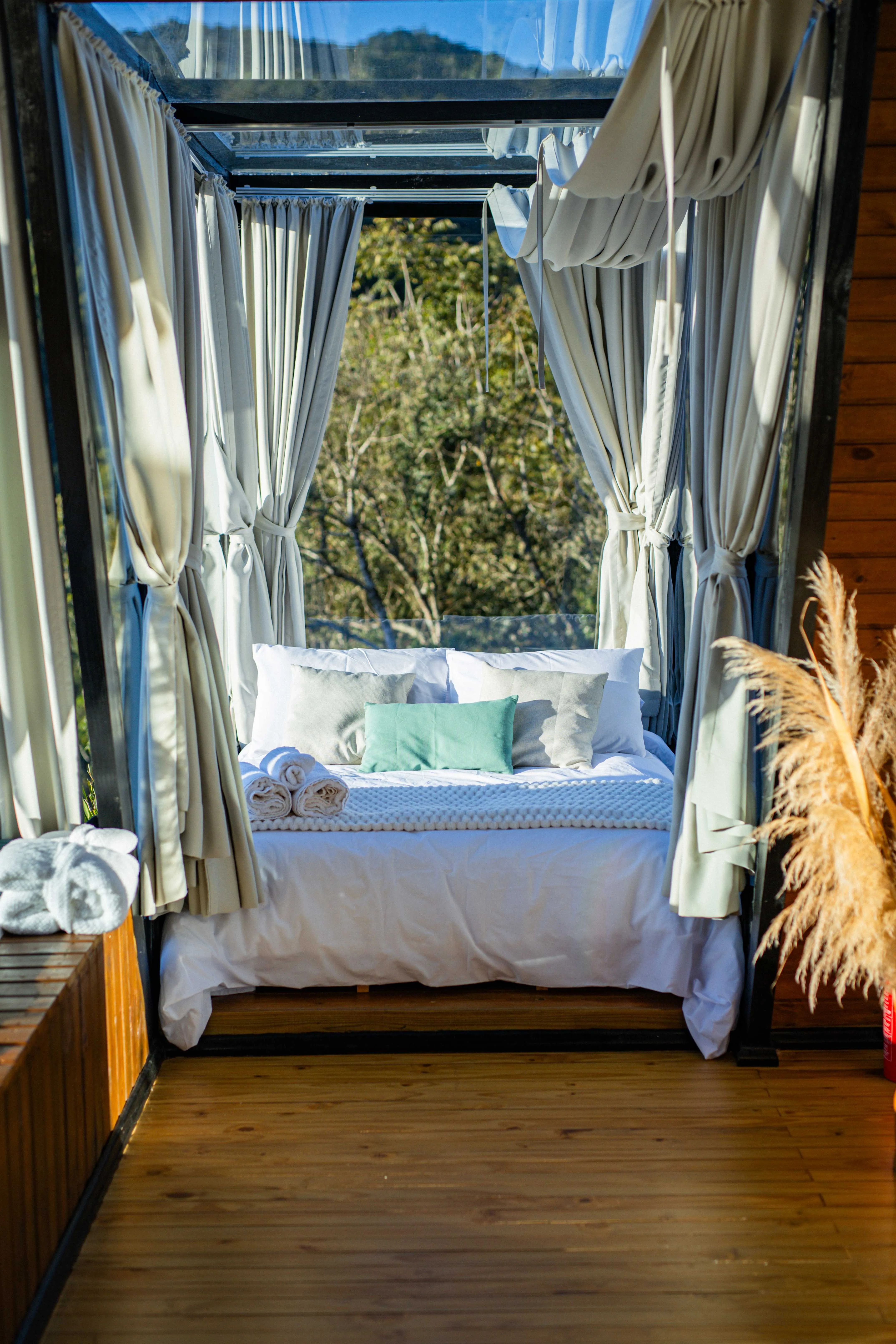 • Quarto de vidro: durma sob as estrelas e acorde cercado pela natureza. O ambiente é equipado com cortinas blackout, garantindo privacidade e conforto.