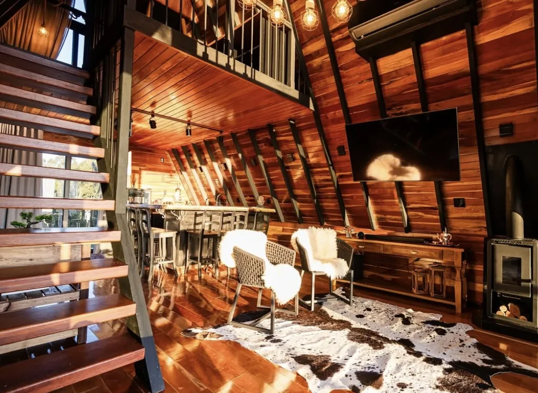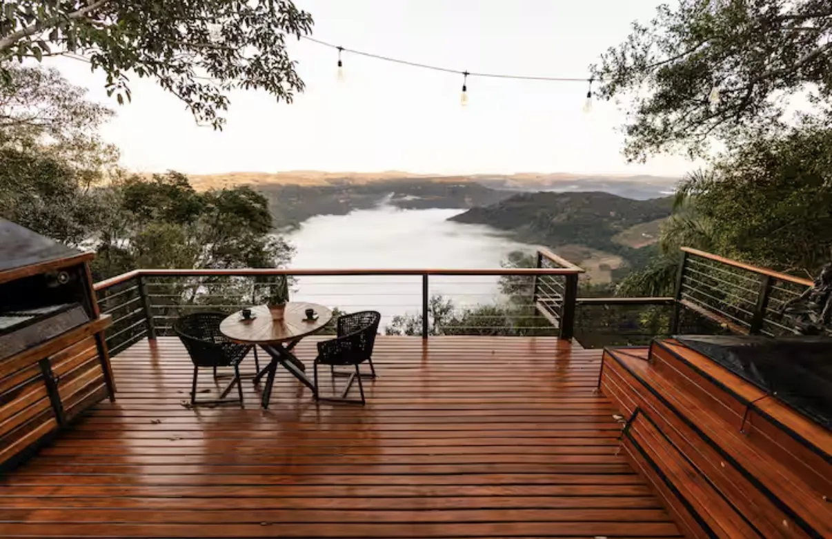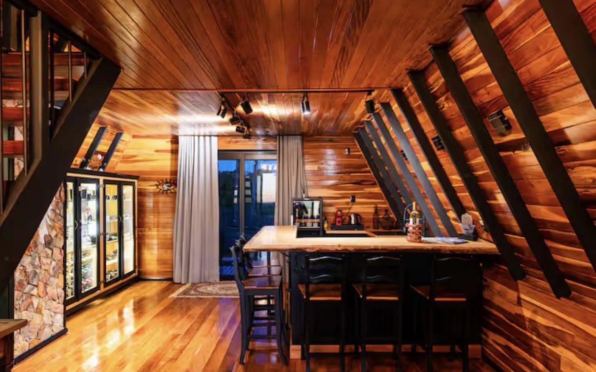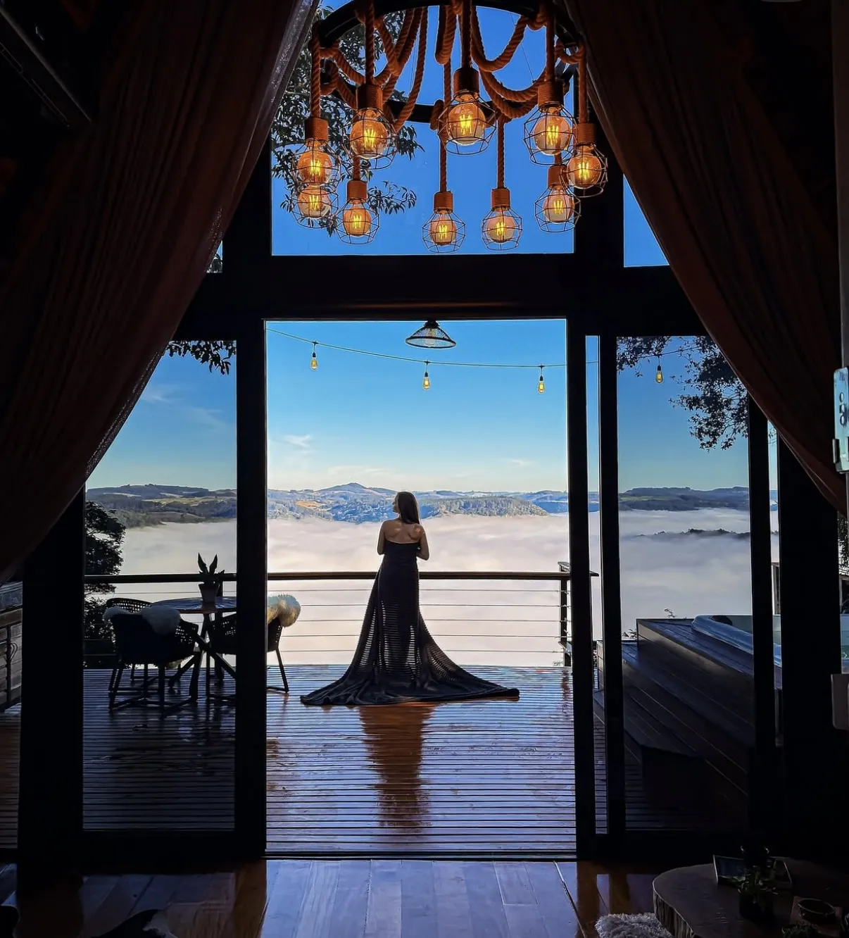 A cabana foi concebida como um refúgio exclusivo em meio às montanhas, unindo arquitetura contemporânea e elementos rústicos em perfeita harmonia com a paisagem natural. O cenário ao redor, marcado por vegetação abundante e horizontes abertos, cria uma atmosfera envolvente, ideal para quem busca desacelerar, contemplar e se afastar da rotina.