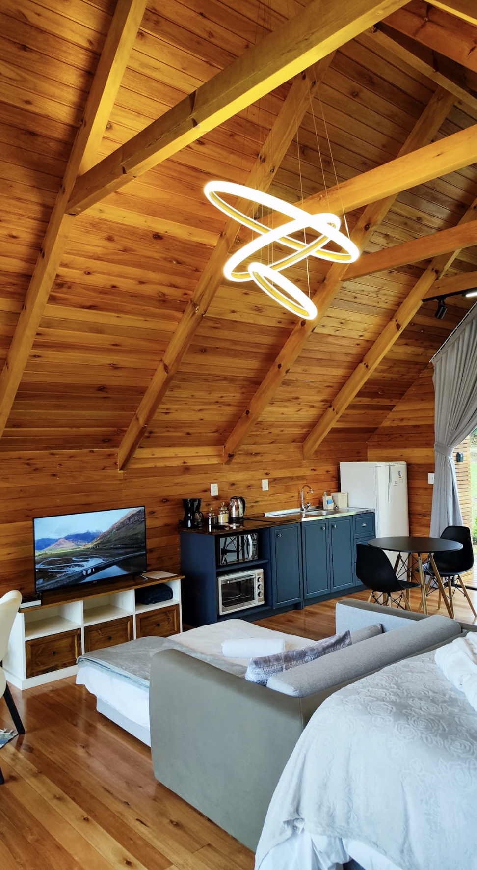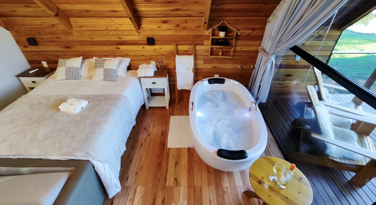 A cabana oferece o equilíbrio perfeito entre o charme rústico e o conforto do moderno, criando um refúgio acolhedor em meio à natureza da Serra Gaúcha. O espaço conta com cozinha completa, equipada com fogão por indução, micro-ondas, forno elétrico, geladeira, cafeteira, chaleira elétrica, torradeira e utensílios diversos, além de taças para vinho, espumante e cerveja. A sala ampla e aconchegante possui smart TV, calefator chileno e um ambiente que convida a momentos românticos e de descanso.