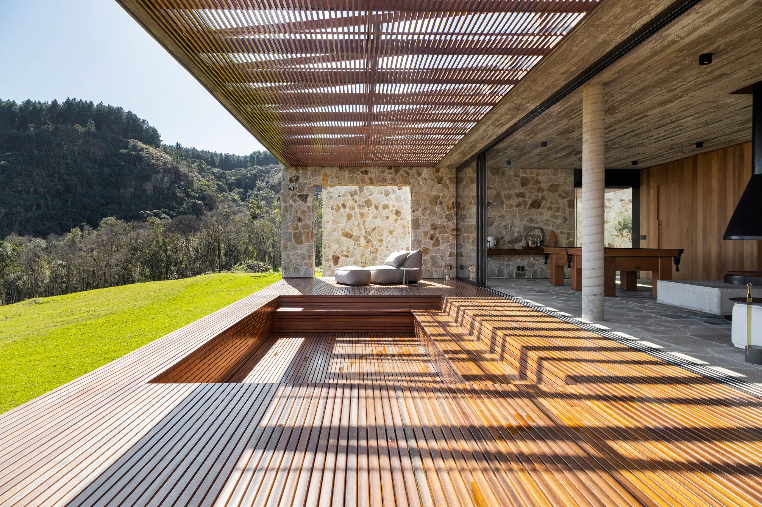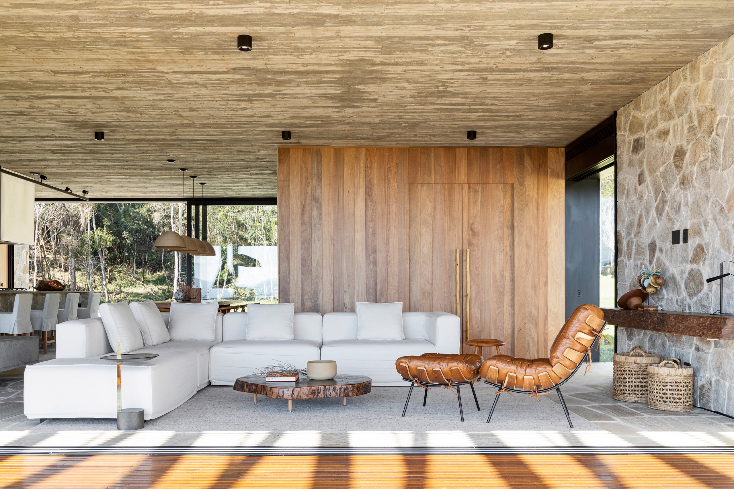 A Casa Entre Peraus está localizada em uma área rodeada por nascentes que formam rios e cachoeiras, oferecendo um refúgio em meio à natureza. Com uma arquitetura contemporânea, a casa “flutua” sobre um platô, proporcionando vistas deslumbrantes para o verde e o horizonte. Seu amplo living e área gourmet se integram perfeitamente com o ambiente ao redor, criando um espaço ideal para relaxamento e contemplação. Este é o local perfeito para desfrutar da serenidade e beleza naturais, oferecendo uma experiência única em meio ao verde.