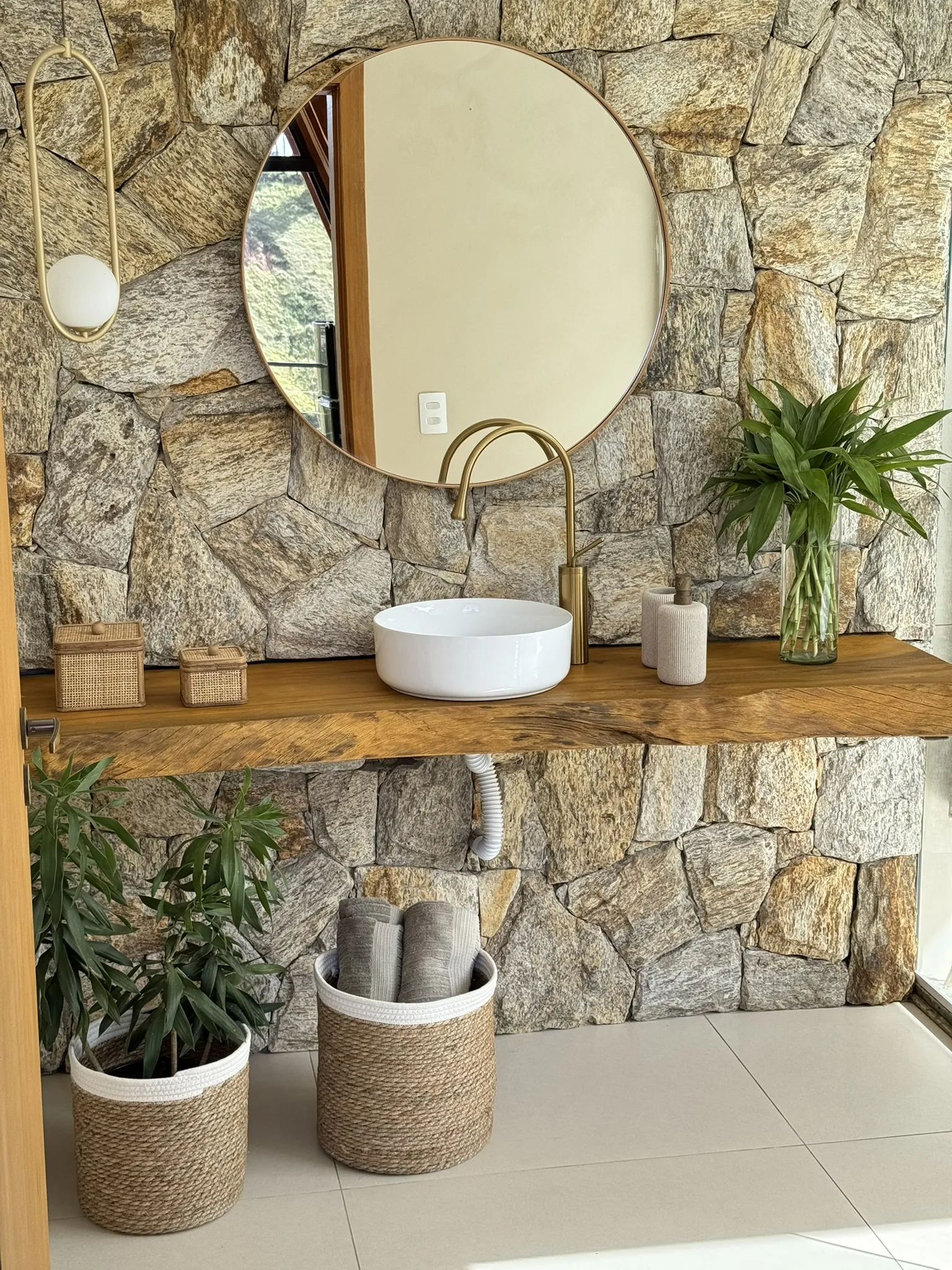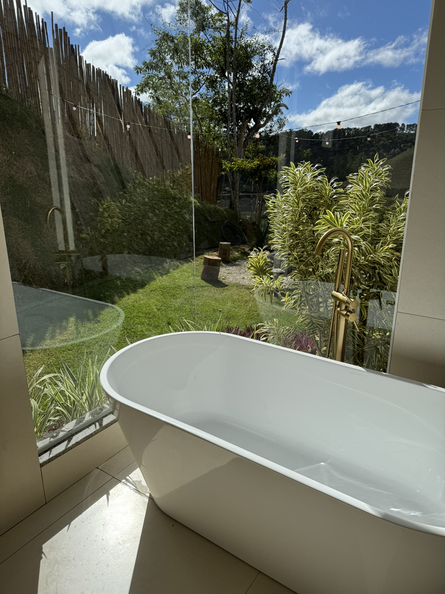 O banheiro oferece chuveiro e torneira aquecidos a gás e o destaque fica por conta da banheira de imersão, perfeita para um banho relaxante e revigorante.