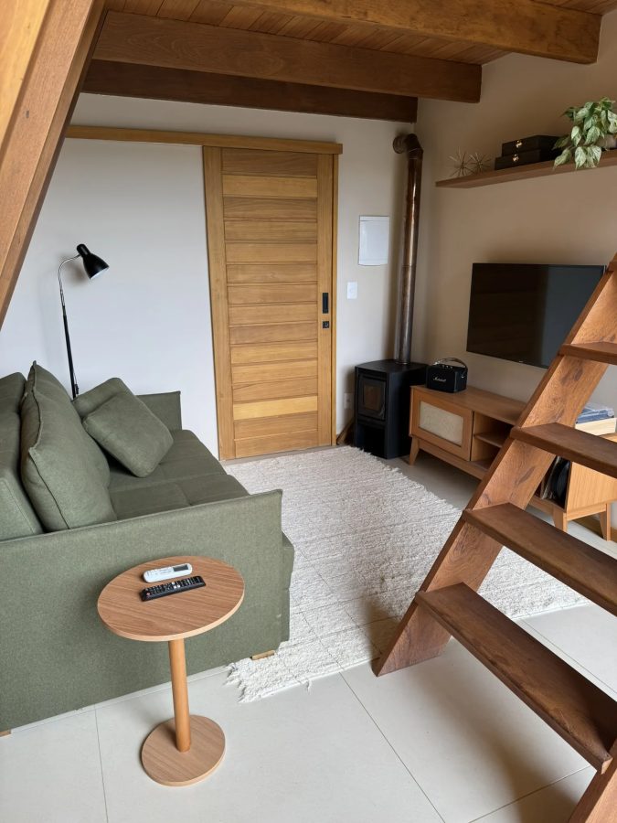 O quarto oferece uma cama de casal confortável e ar-condicionado. Na sala, o ambiente é acolhedor e equipado com sofá retrátil, Smart TV, calefator a lenha, vitrola com discos, caixa de som, baralho e alguns jogos para momentos de lazer e descontração.