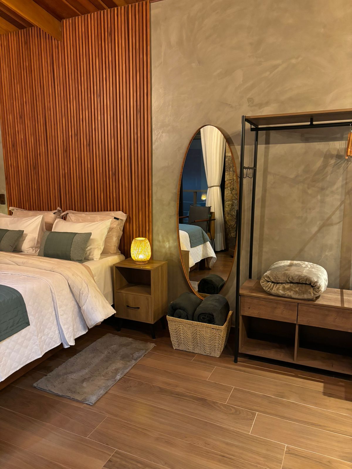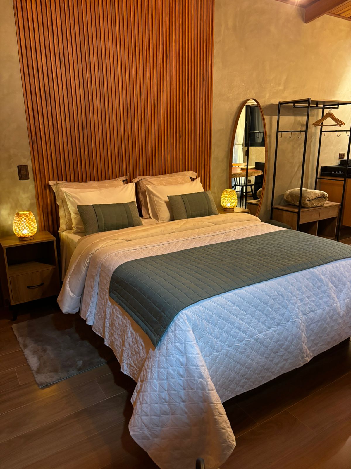 ● Cama queen size com enxoval premium Buddemeyer (400 fios), proporcionando conforto e qualidade ao sono;