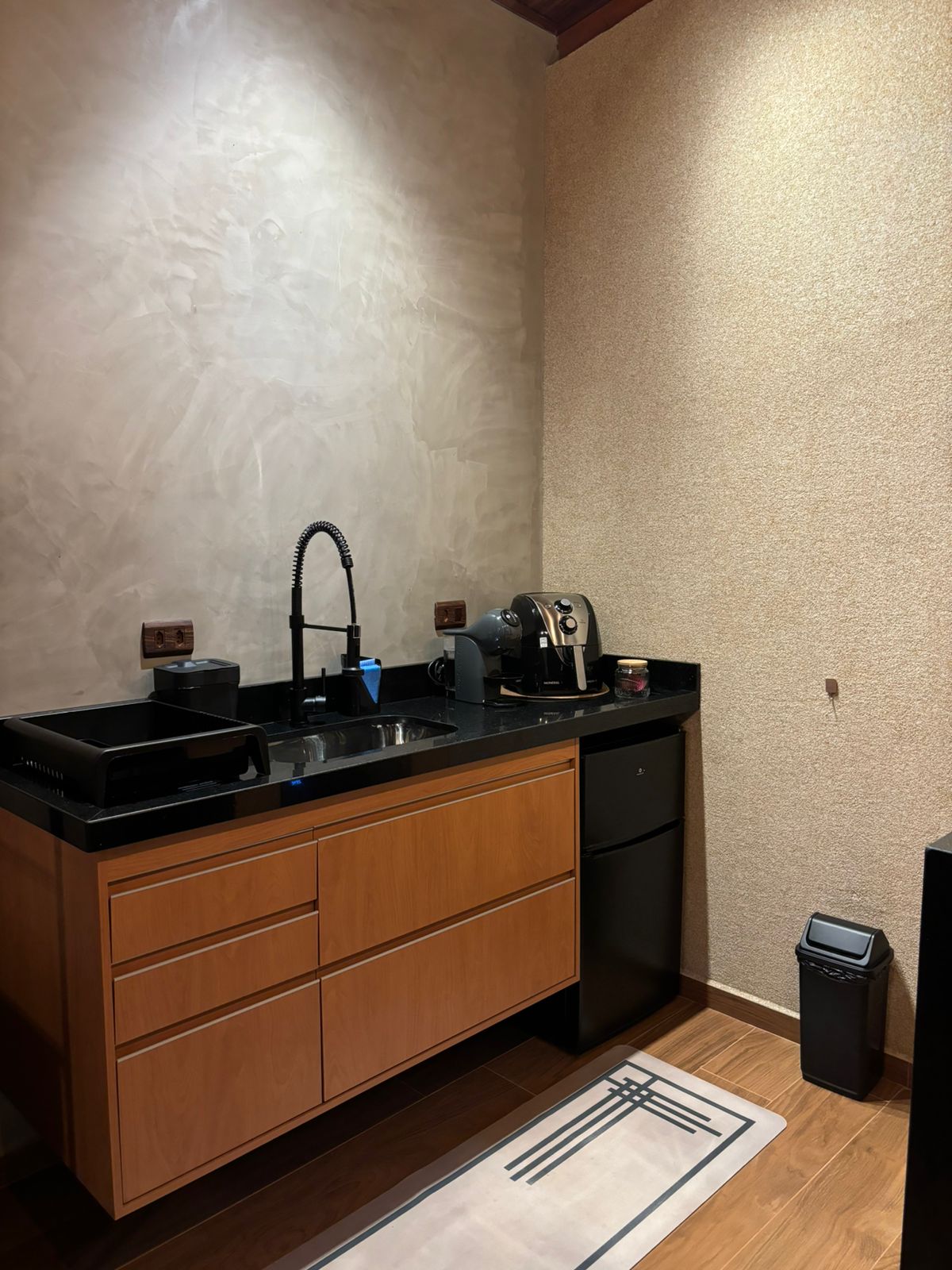 ● Cozinha completa: equipada com fogão elétrico, airfryer, frigobar, microondas, cafeteira elétrica e cafeteira por cápsulas (Dolce Gusto), liquidificador, além de todos os talheres, copos, xícaras, taças e utensílios para preparar suas próprias refeições;