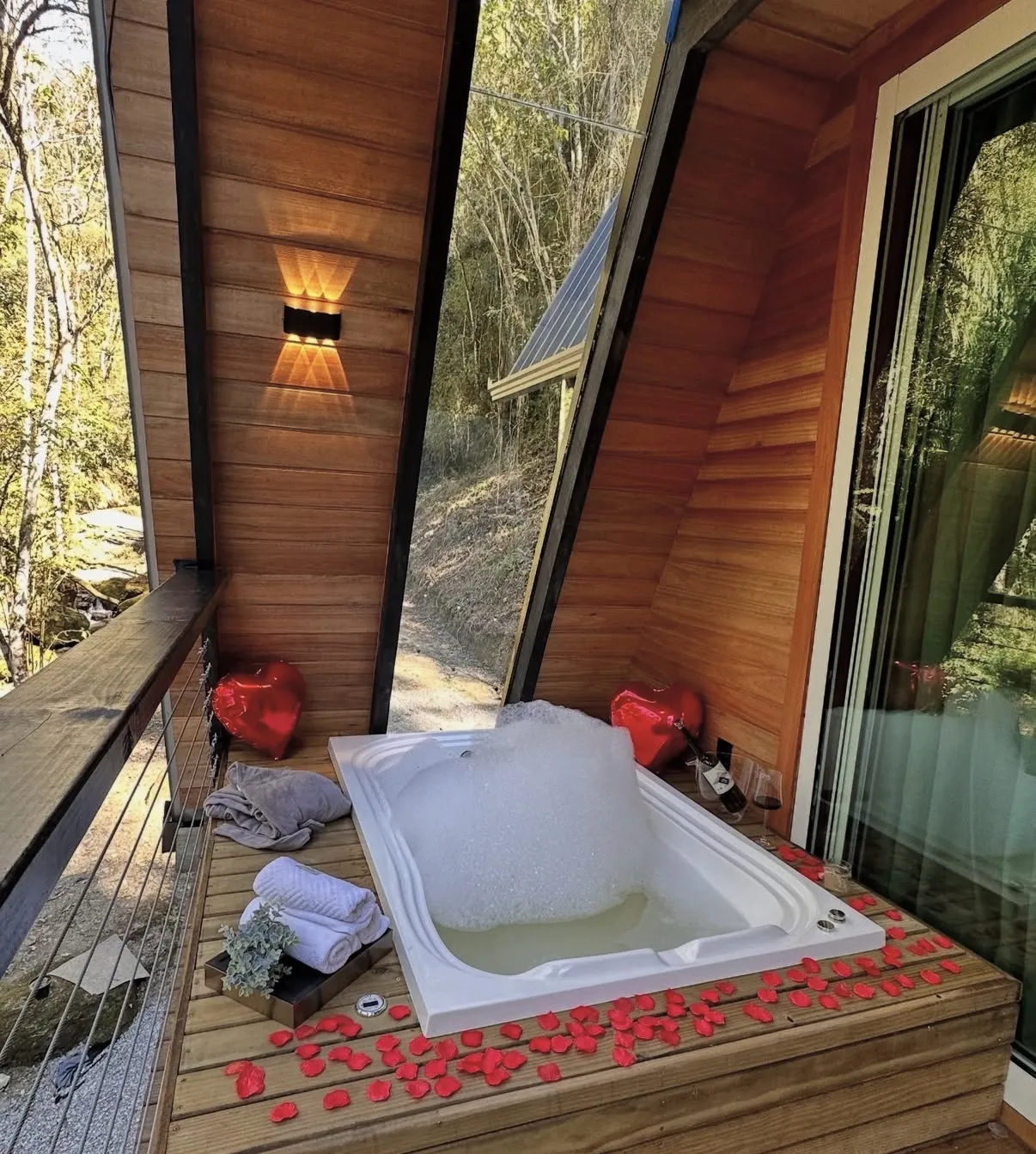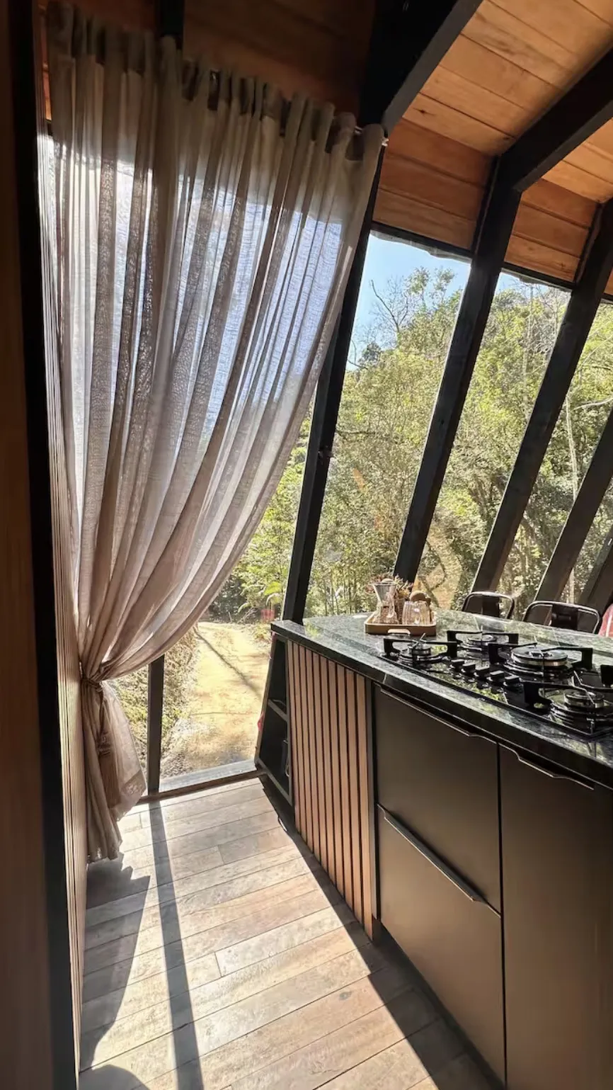 Com lareira, hidromassagem, fogueira de chão e uma vista incrível para as montanhas e cachoeiras da região, a hospedagem oferece uma experiência completa de relaxamento. Cada detalhe foi pensado para proporcionar aconchego, tranquilidade e bem-estar em meio ao verde.