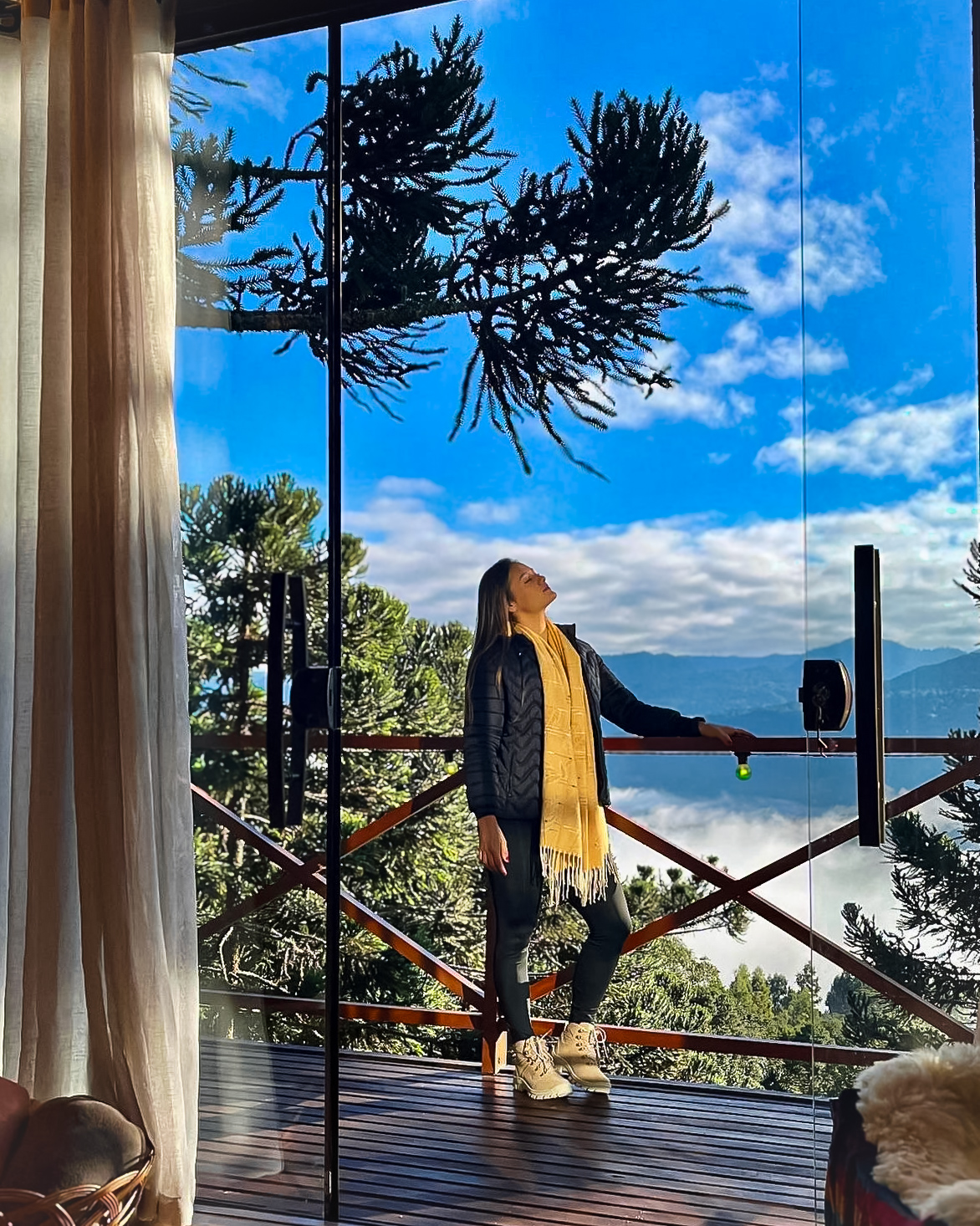 O refúgio dispõe de um mezanino com cama de casal e vista para o vale, banheira com hidromassagem e cromoterapia, sala de estar com lareira, TV com streamings e iluminação adaptável, garantindo bem-estar. A cozinha possui utensílios básicos para preparar as refeições, e o espaçoso deck proporciona uma vista impressionante do vale, com um incrível amanhecer sobre as nuvens. A área externa é ideal para aproveitar a serenidade e a natureza ao redor.