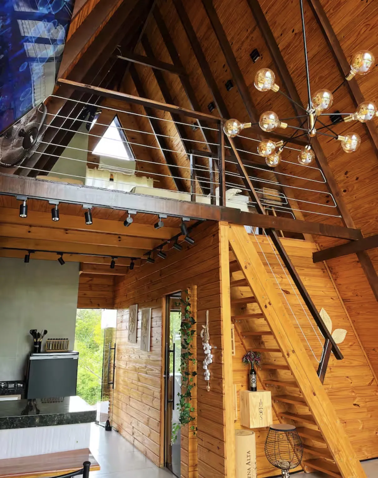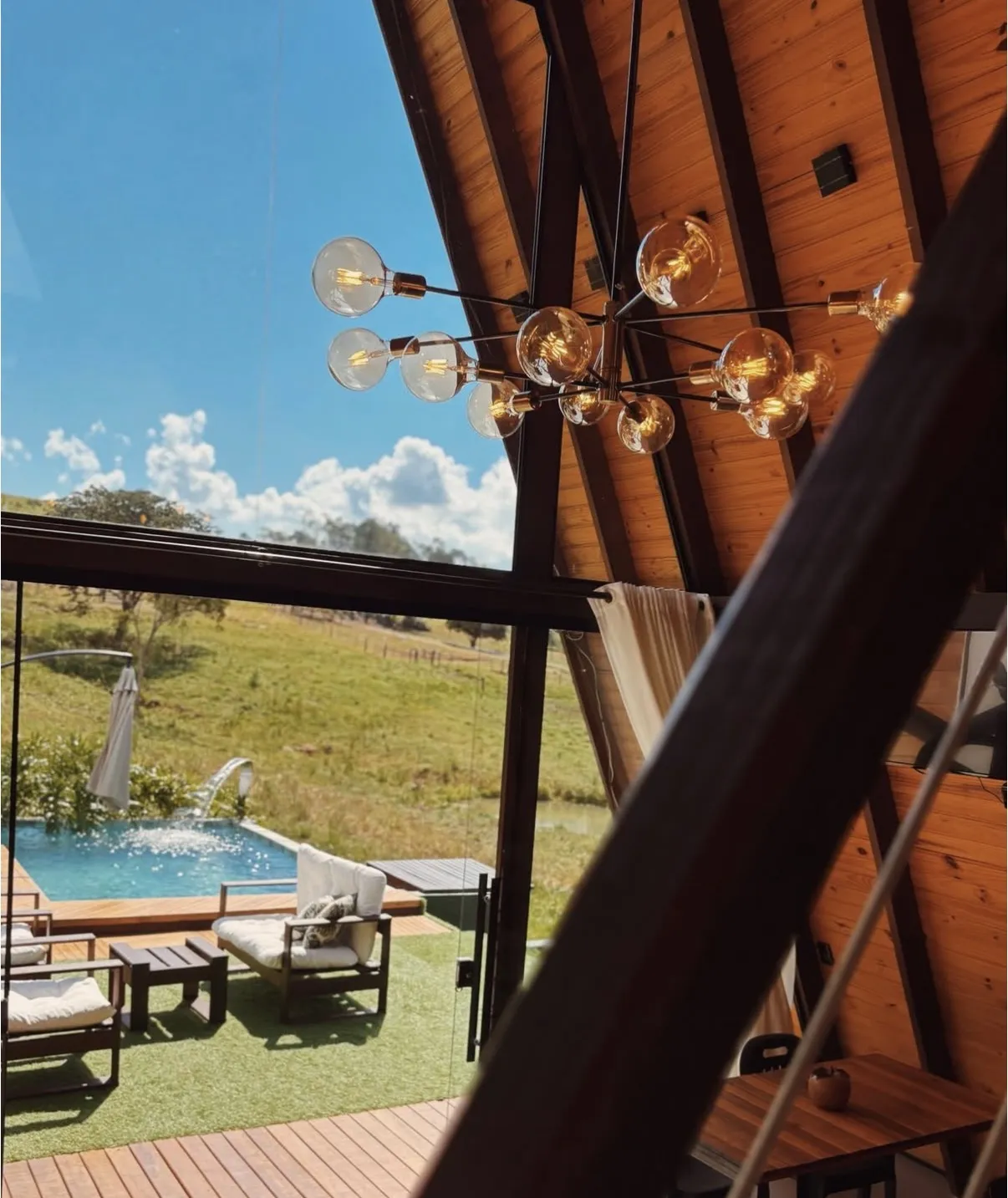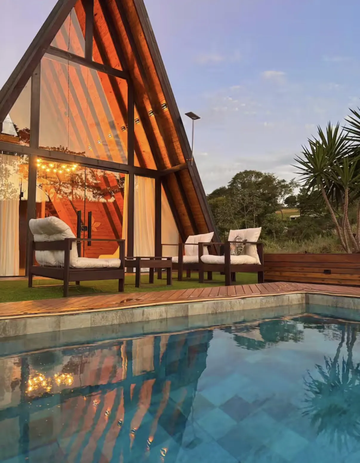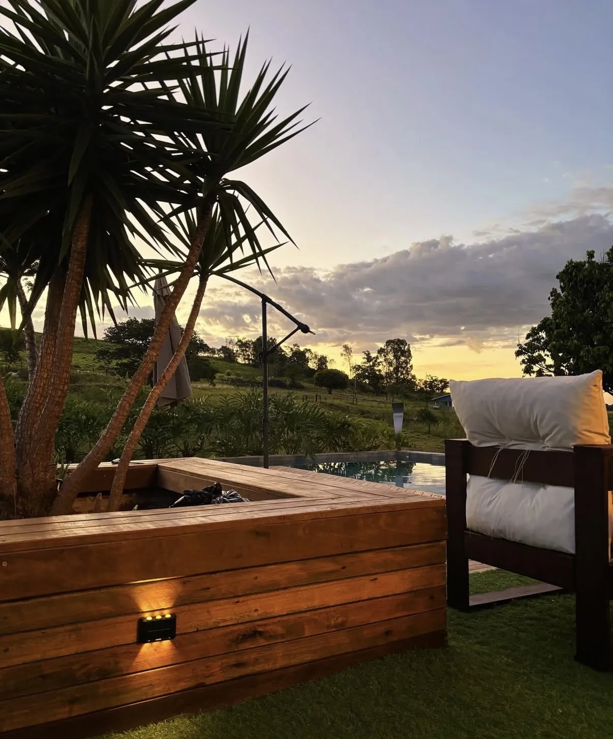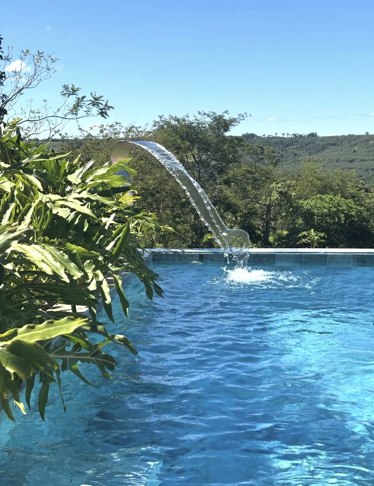 A experiência se completa com piscina equipada com cascata e hidromassagem, ideal para relaxar e contemplar o entorno. Ao anoitecer, o clima se torna ainda mais especial, convidando a aproveitar o silêncio e a privacidade em um cenário único, enquanto o espaço também oferece estrutura adequada para quem deseja conciliar descanso com momentos de produtividade.