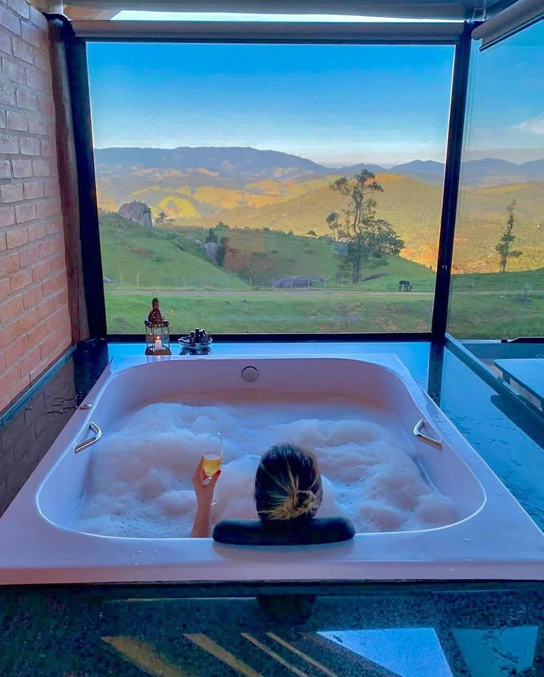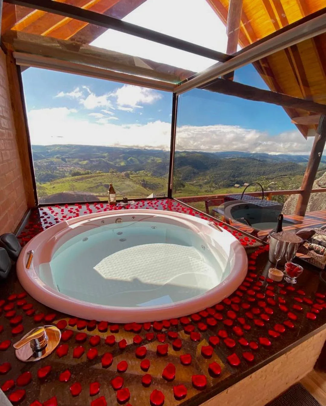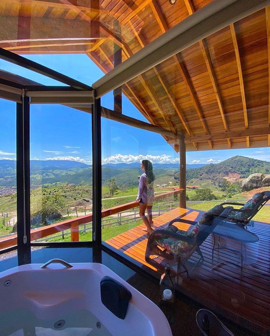 Os chalés estão localizados no alto da montanha, com uma vista exuberante para a bela Serra da Mantiqueira, a uma altitude de aproximadamente 1200 metros.